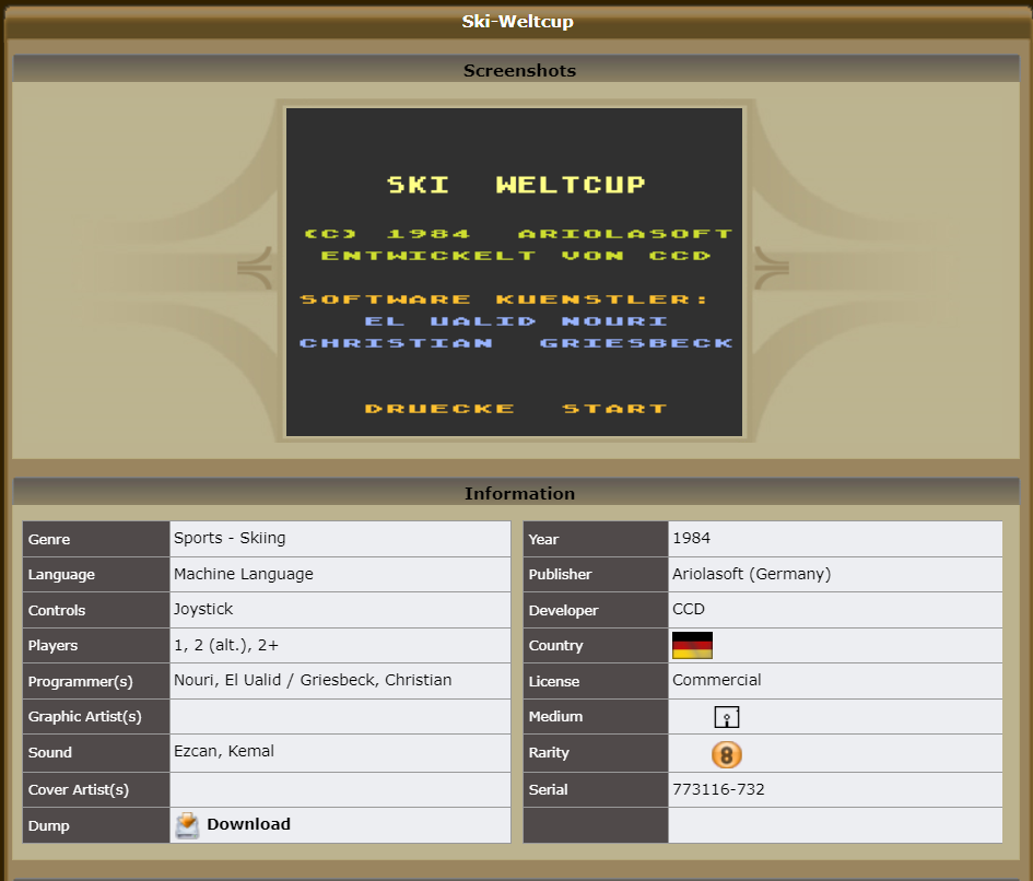 das Spiel hat einen Editor, in einigen PD-Bibliotheken, wie Page 6, HAPS, Bellcom, etc. (auch Abbuc) ist es als Ski King II (oder Ski King 2) zu finden...