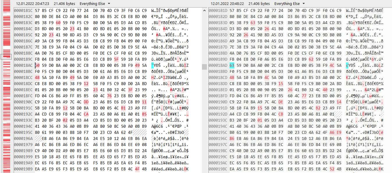 Der Screenshot stammt von einem binären Diff der beiden Dateien und zeigt einen Ausschnitt aus dem ersten Drittel.