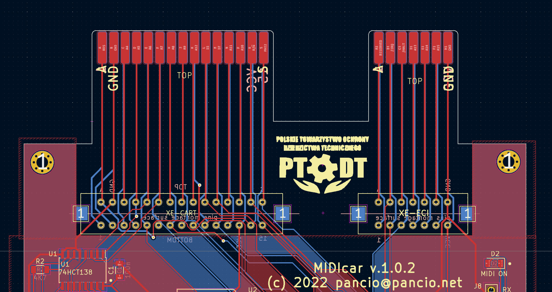 According to PCB design. Yes, I used 100nF capacitors for all ICs close to power lines. MIDIcar can use addresses from on $D1XX and $D5XX with $20B window - base address is fully jumpered. So we have no conflict with Sparta at all.