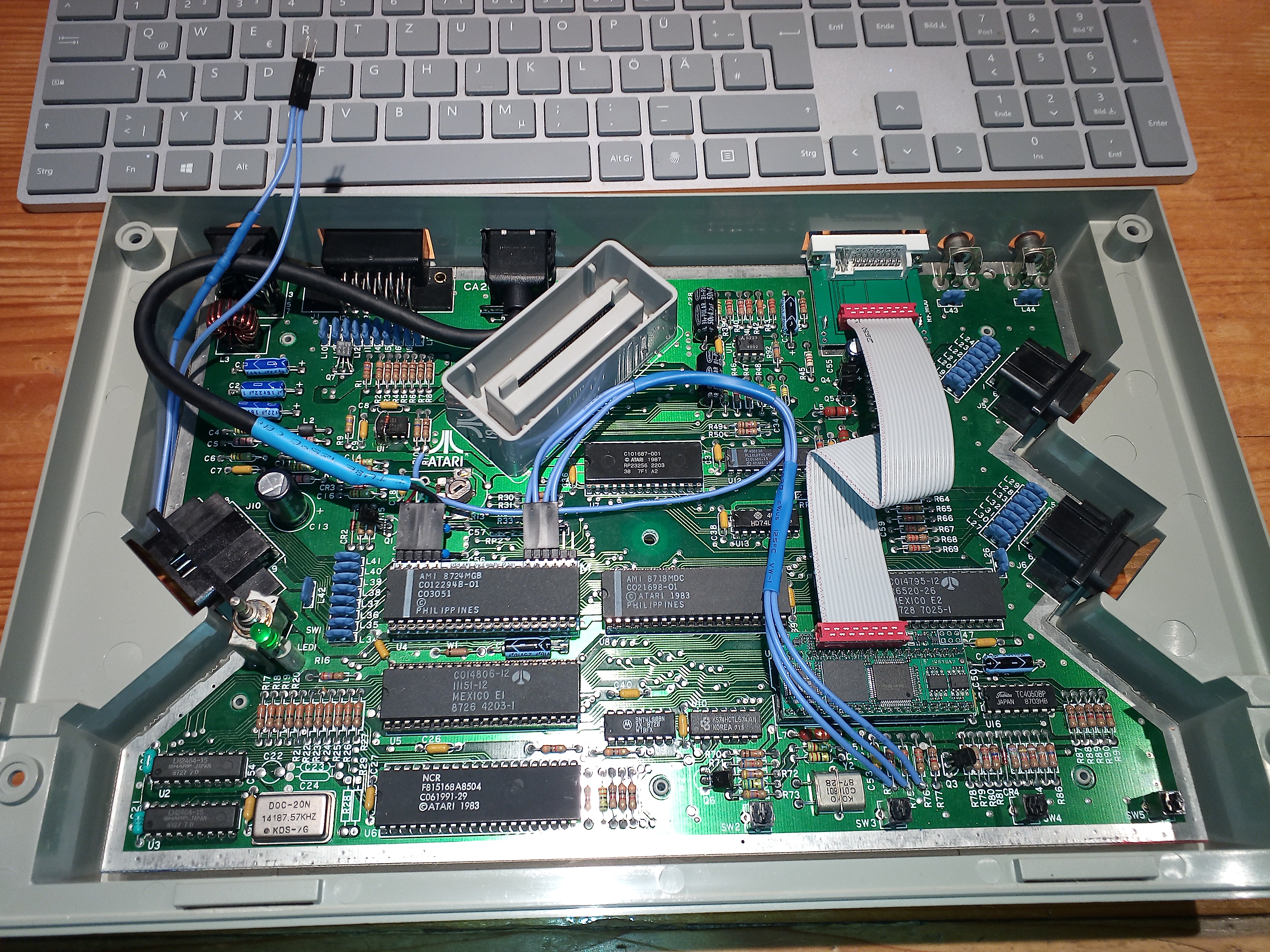 Im XEGS will es nicht funktionieren. Ein "Schaltbare" Brücke zwischen Pin 13 und 5v am XEGS Keyboard-Port habe ich ebenfalls eingebaut, um eine Angeschlossen Tastatur zu simulieren. Ich hab ne weile gebraucht um rauszufinden das die Beschriftung der Pins des Tastaturports auf der Platine spiegelverkehrt sind. :roll: . Trotz allem nimmt das XEGS keine Taste entgegen. Anbei ein Bild vom Einbau.
