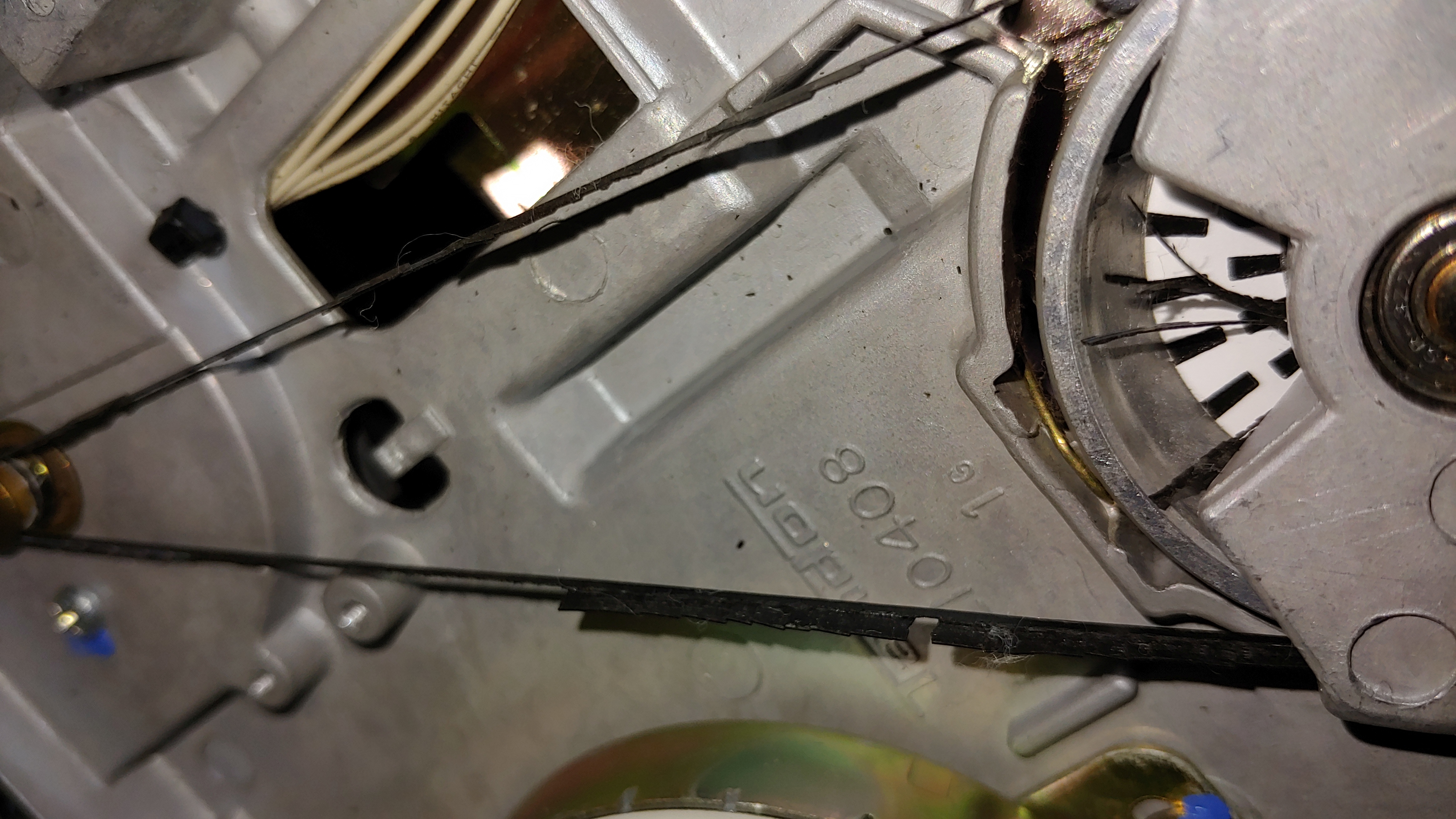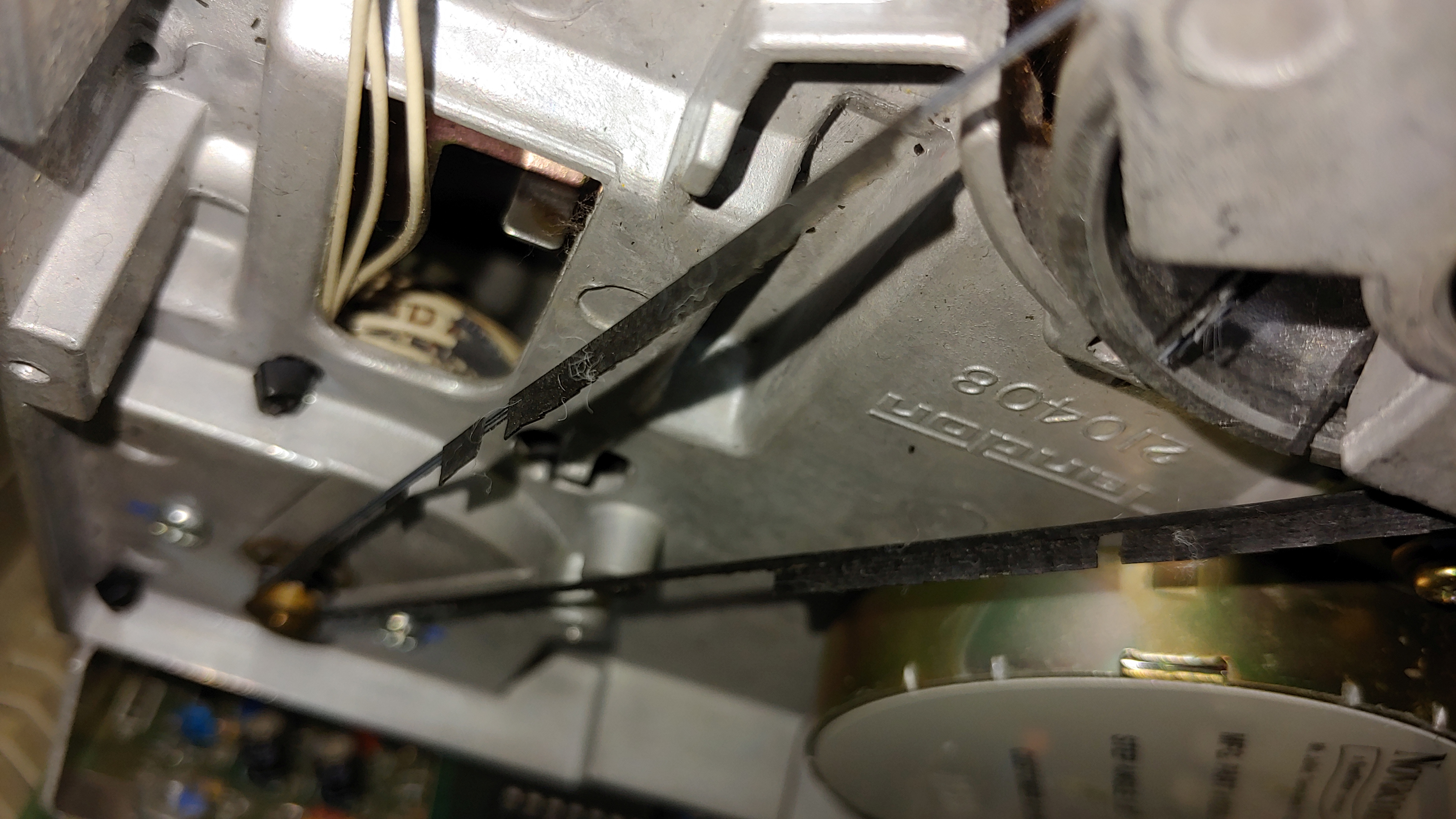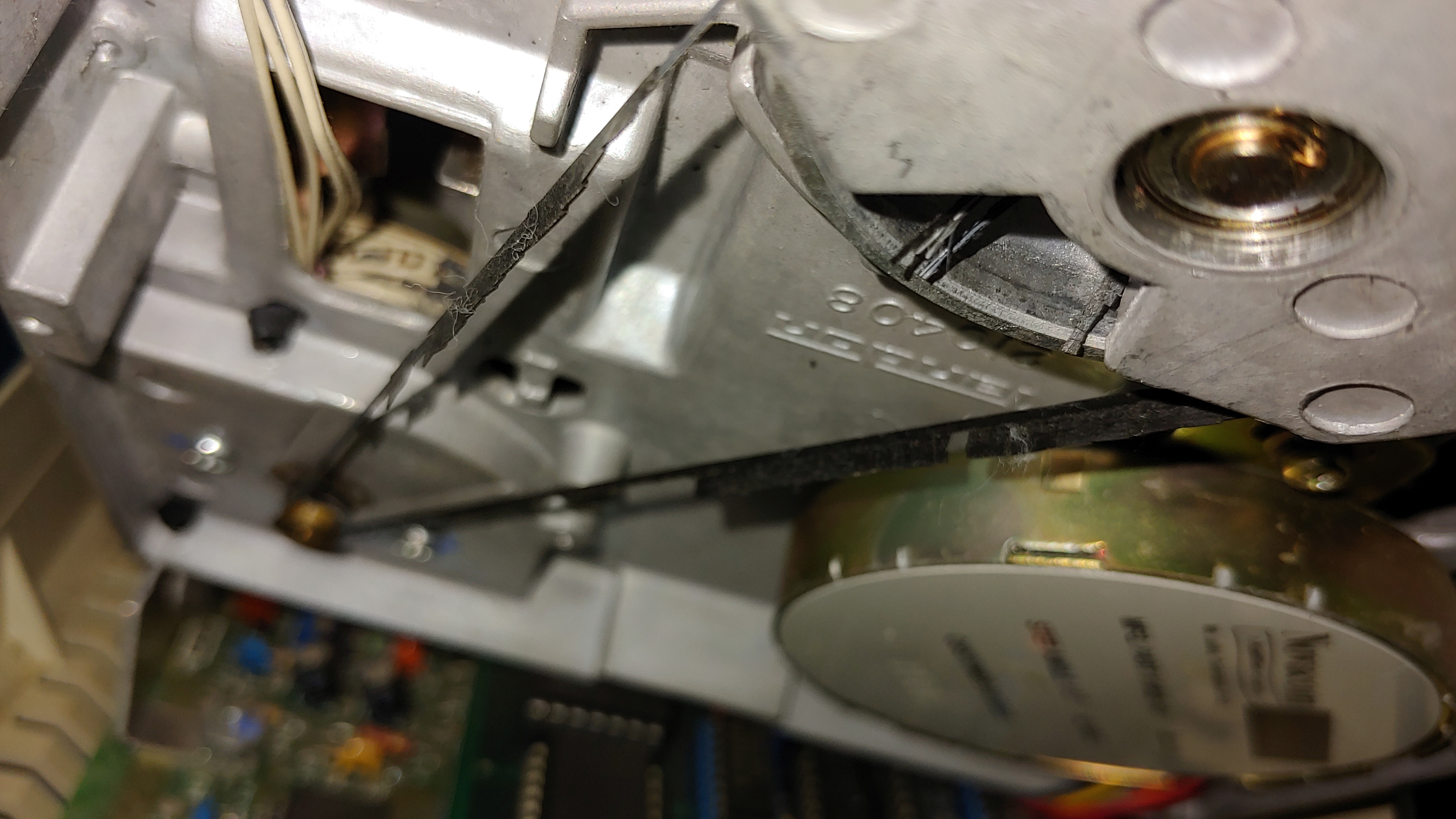 War grad am kopieren von ein paar DD-Disketten mit meinem einzigen DD-fähigen Laufwerk, plötzlich ging's nicht mehr, Read Error, Laufwerk aufgemacht, offensichtlich hat's den Riemen zerfasert, vom Gewinde sind feine Fasern rausgehangen, hab ich abgeschnitten, wohl aber noch Reste ums Gewinde gewickelt, Diskette dreht sich nicht mehr.