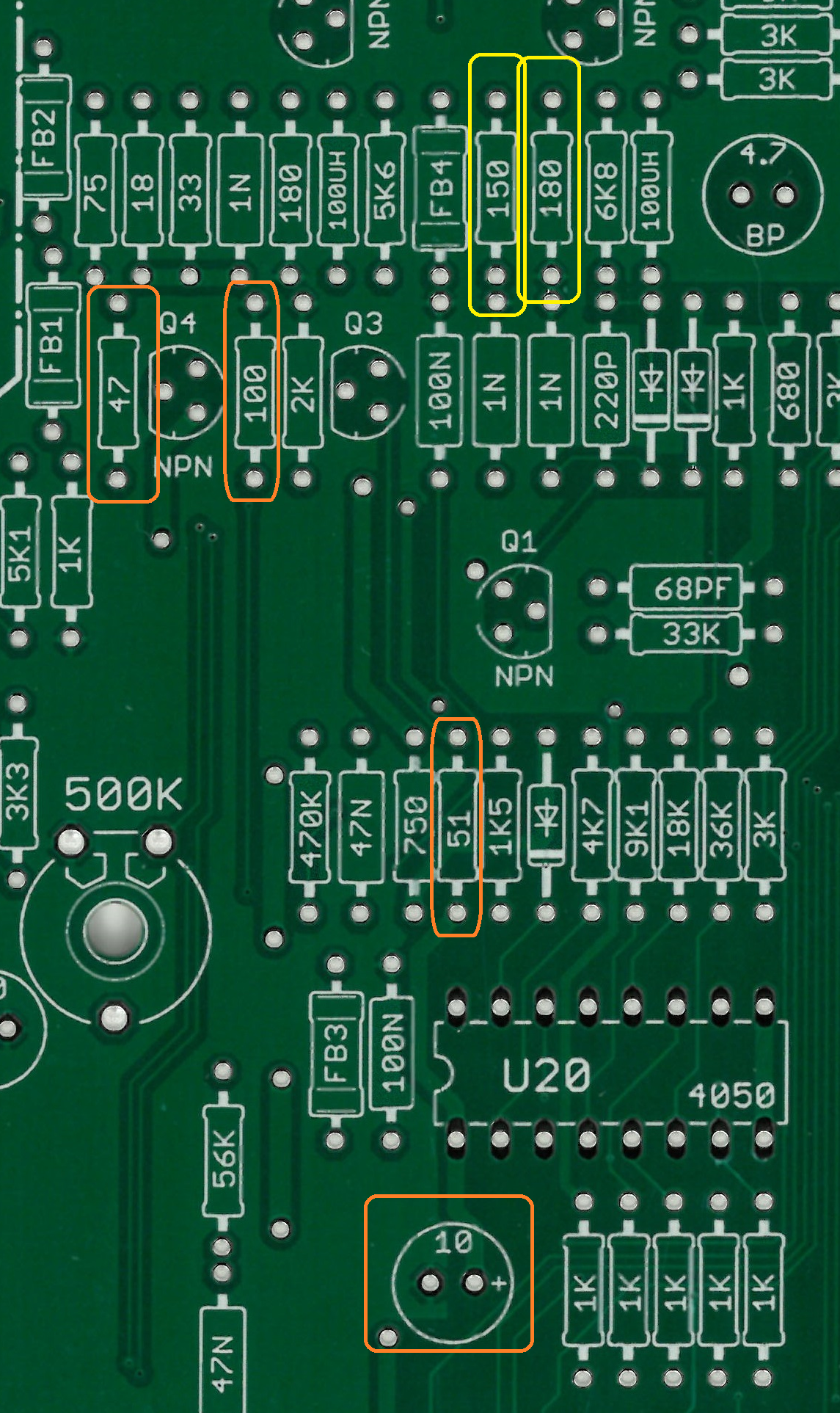 Die Widerstände 150R, 180R, 47R und 100R müssen gemäß der Anleitung 75 Ohm sein. Der 51R Widerstand wird in der Anleitung mit 10R gebrückt, was in 8.2 Ohm resultiert.