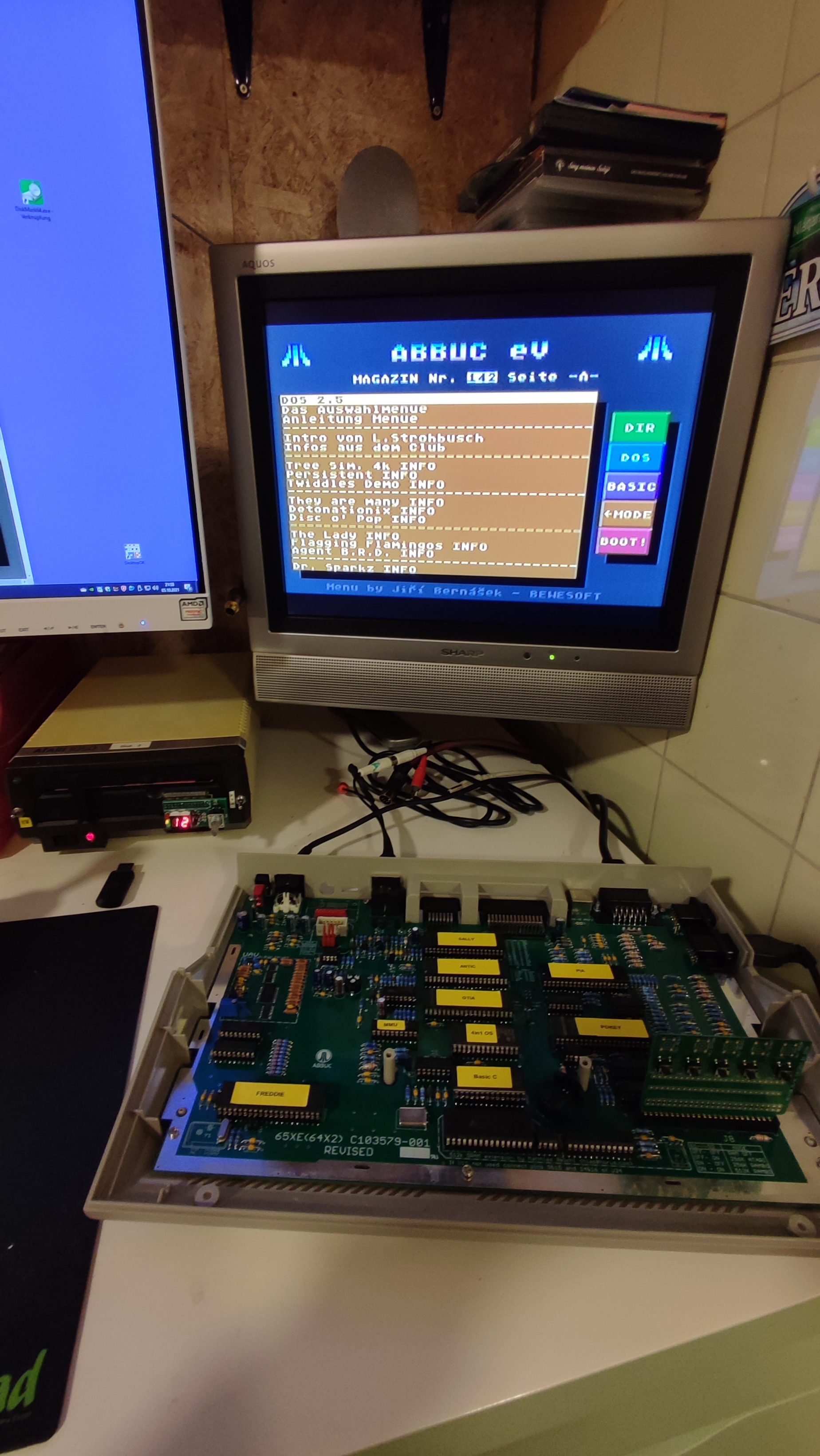 Alle Bauteile (Ausser DVI) sind aufgelötet. Grundfunktionen bisher alle tadellos. Booten per Hispeed über Speedy beschleunigte 1050 klappt problemlos. Joystick funzt. Tastatur auch. Bild und Ton kommen sauber am Monitor an.