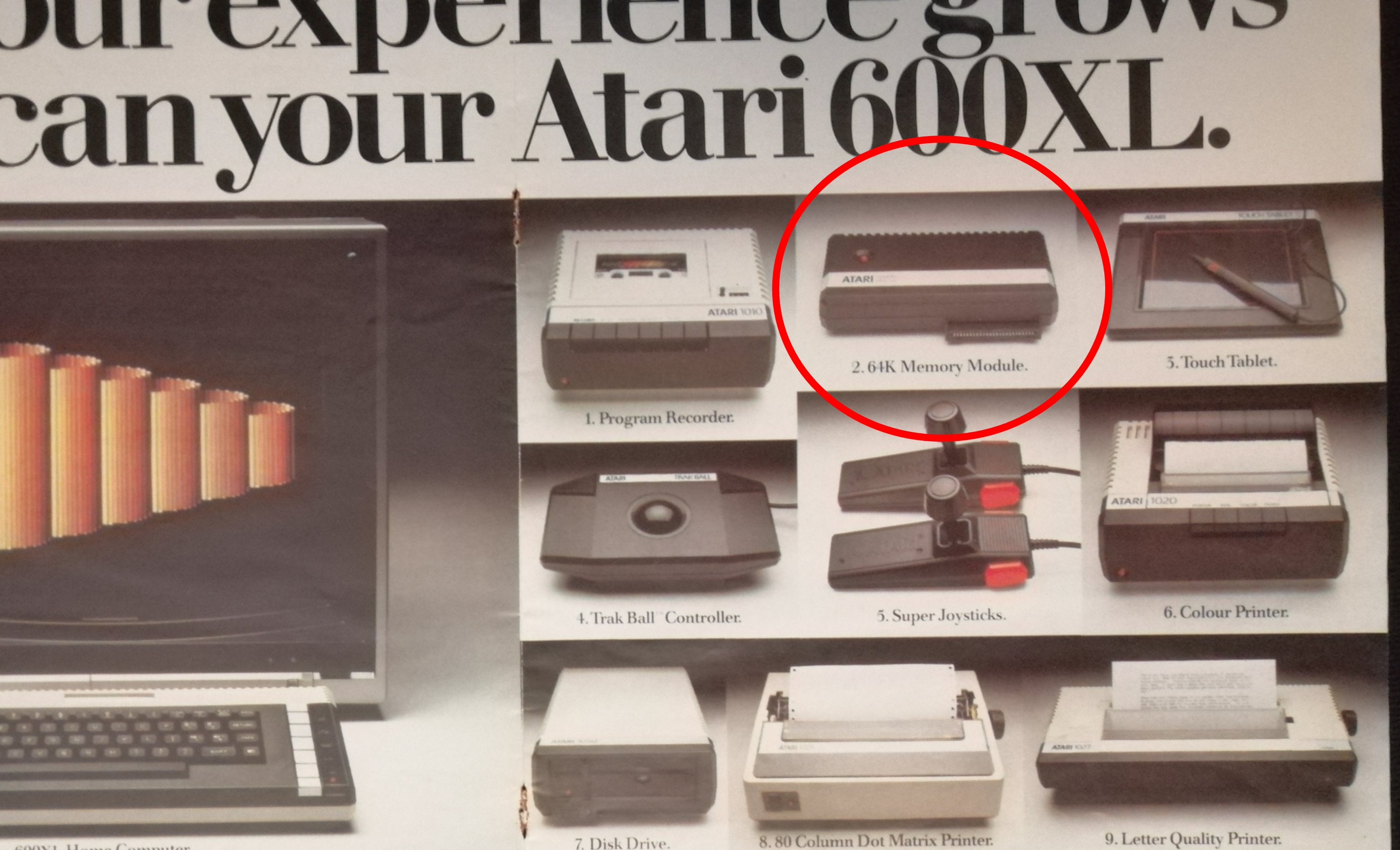 64K-RAM-Expansion für den ATARI 600XL gezeigt wird, allerdings in (dunkel-)braun und mit einer roten LED