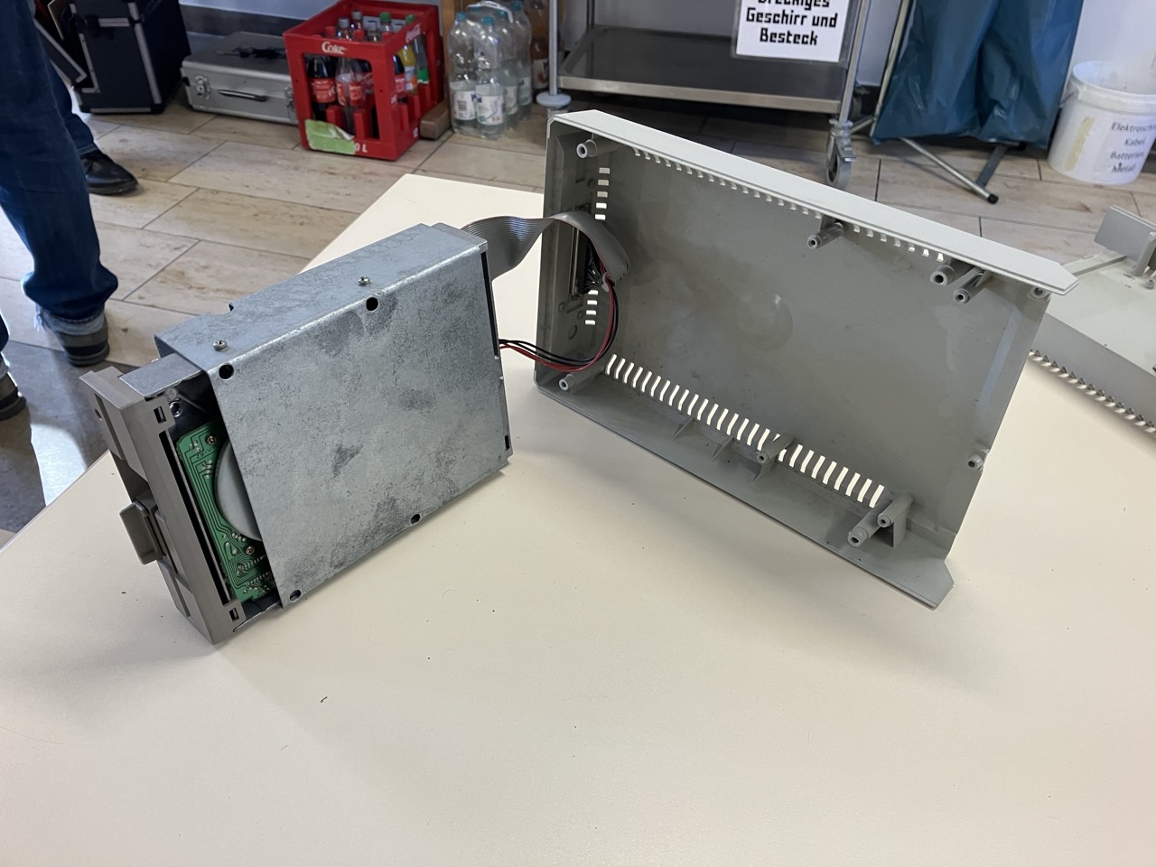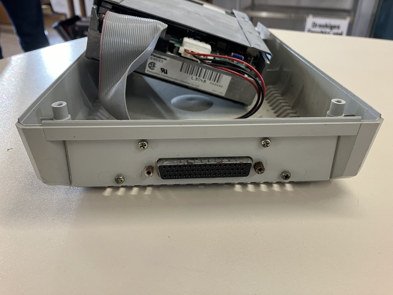 Innen drin ist ein 5 1/4 Laufwerk, hinten ein vielpoliger Stecker.
