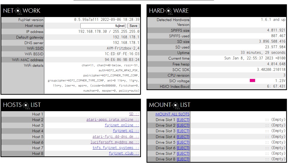 Obwohl der Atari eingeschaltet ist und Fujinet läuft, zeigt mir die Weboberfläche von Fujinet immer nur unter SIO Voltage 1.206V an. Siehe Anhang: