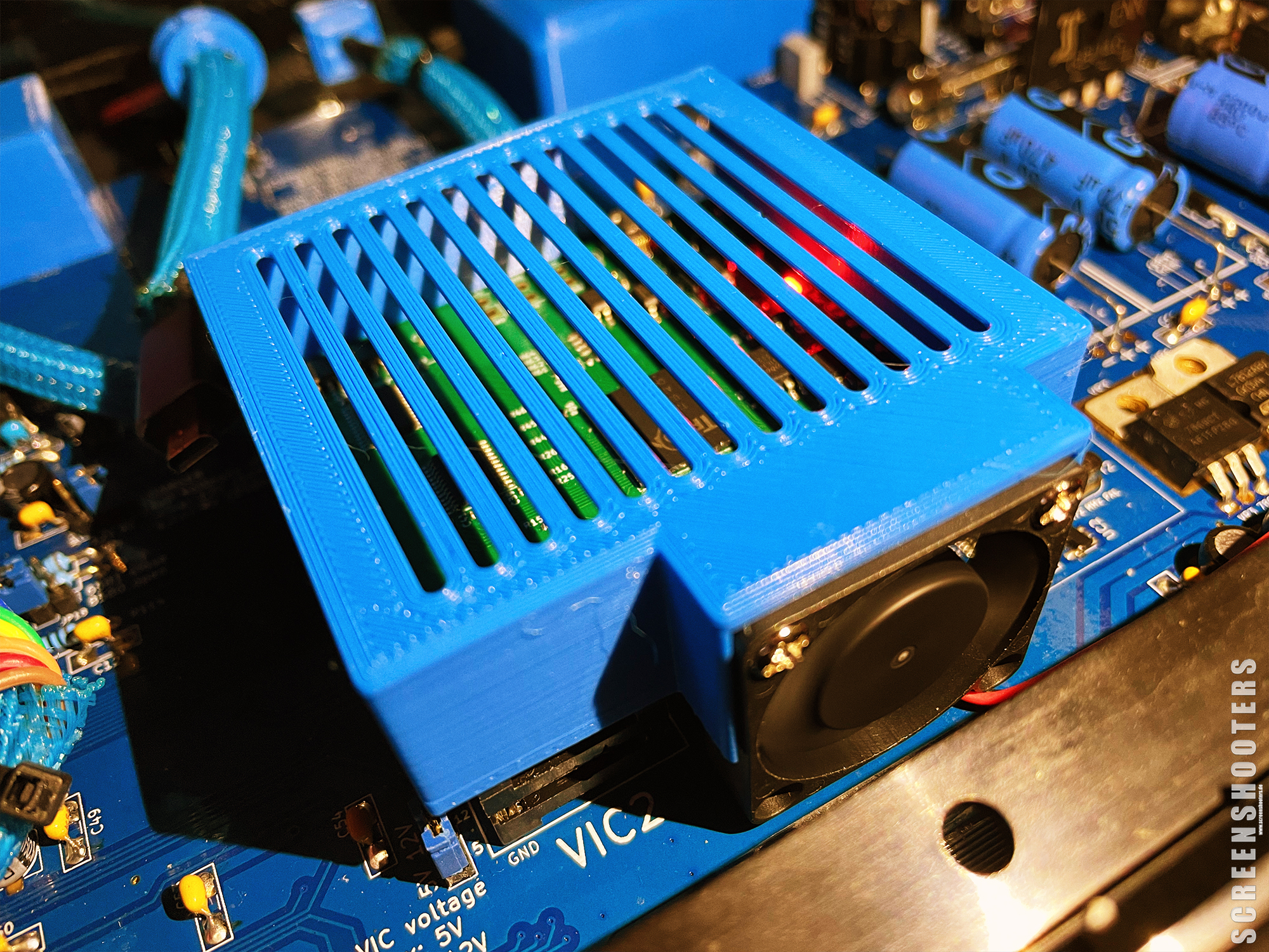 Von Noctua gibt es einen 40mm Lüfter der mit 5V betrieben werden kann, perfekt! Den Deckel vom Kawari nochmal neu gestaltet, jetzt sitzt der Lüfter oben im Deckel - wenn man eh schon dabei ist wird auch noch etwas an der Beleuchtung gearbeitet. Ein Lichtleiter zog ein, SIDKick und die Controller-Port-Abdeckung wurden nochmal neu gedruckt - der Schriftzug nun mit fluoreszierendem Filament (der vom Kawari ist gerade im Druck) :