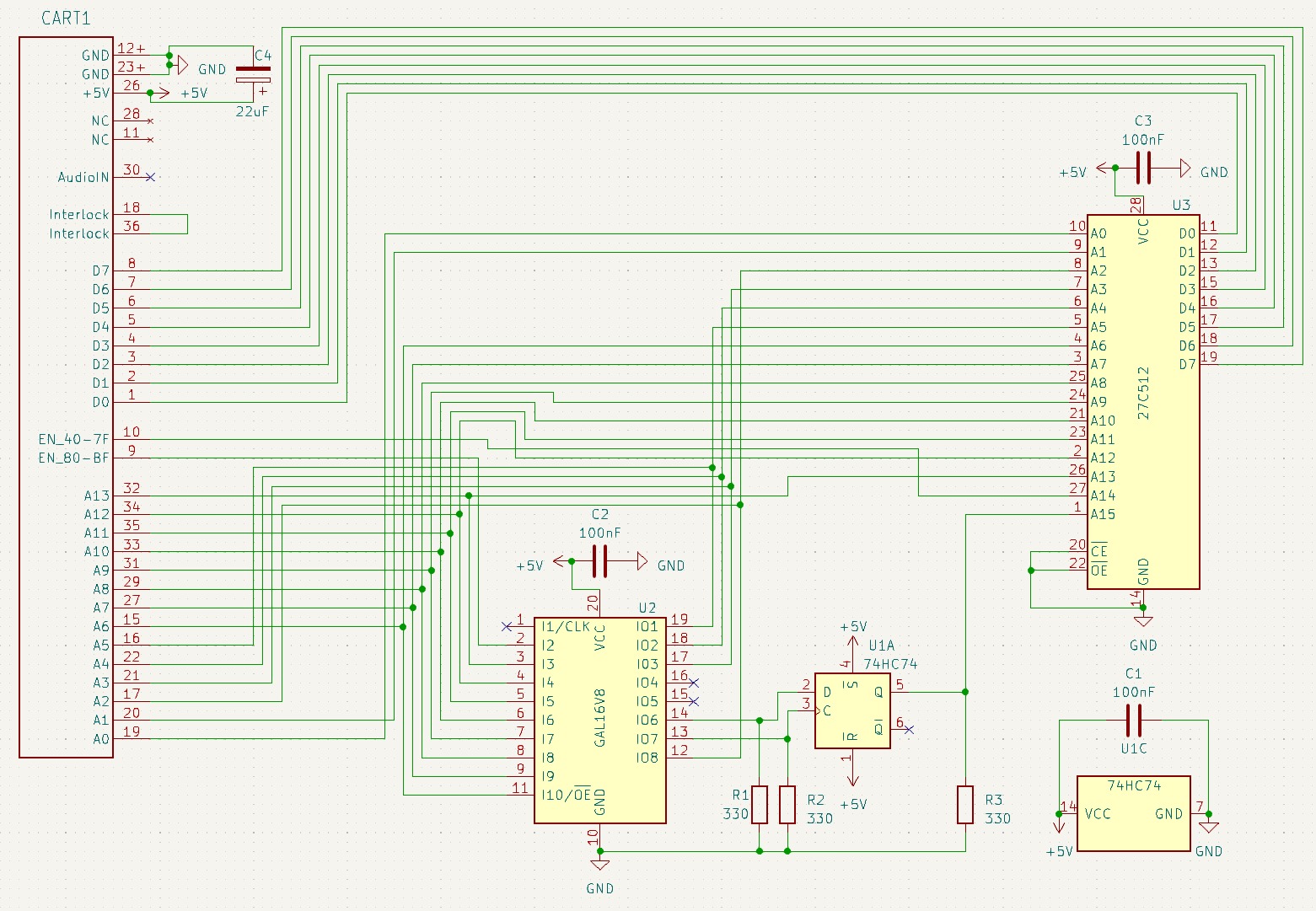 Nun wollte ich mir selbst ein Modul basteln, welches 64kb ROM zur Verfügung stellt. Umgeschaltet werden die beiden 32kb durch einen Zugriff im oberen ROM-Bereich. Ein EEPROM, ein GAL und ein FlipFlop sollten reichen, oder?
