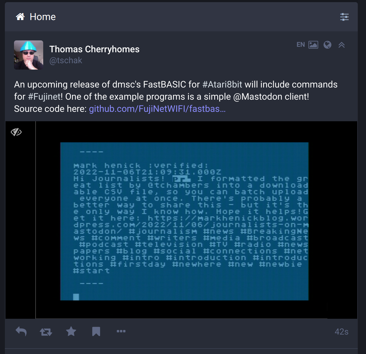 An upcoming release of dmsc's FastBASIC for #Atari8bit will include commands for #Fujinet! One of the example programs is a simple @Mastodon client!
