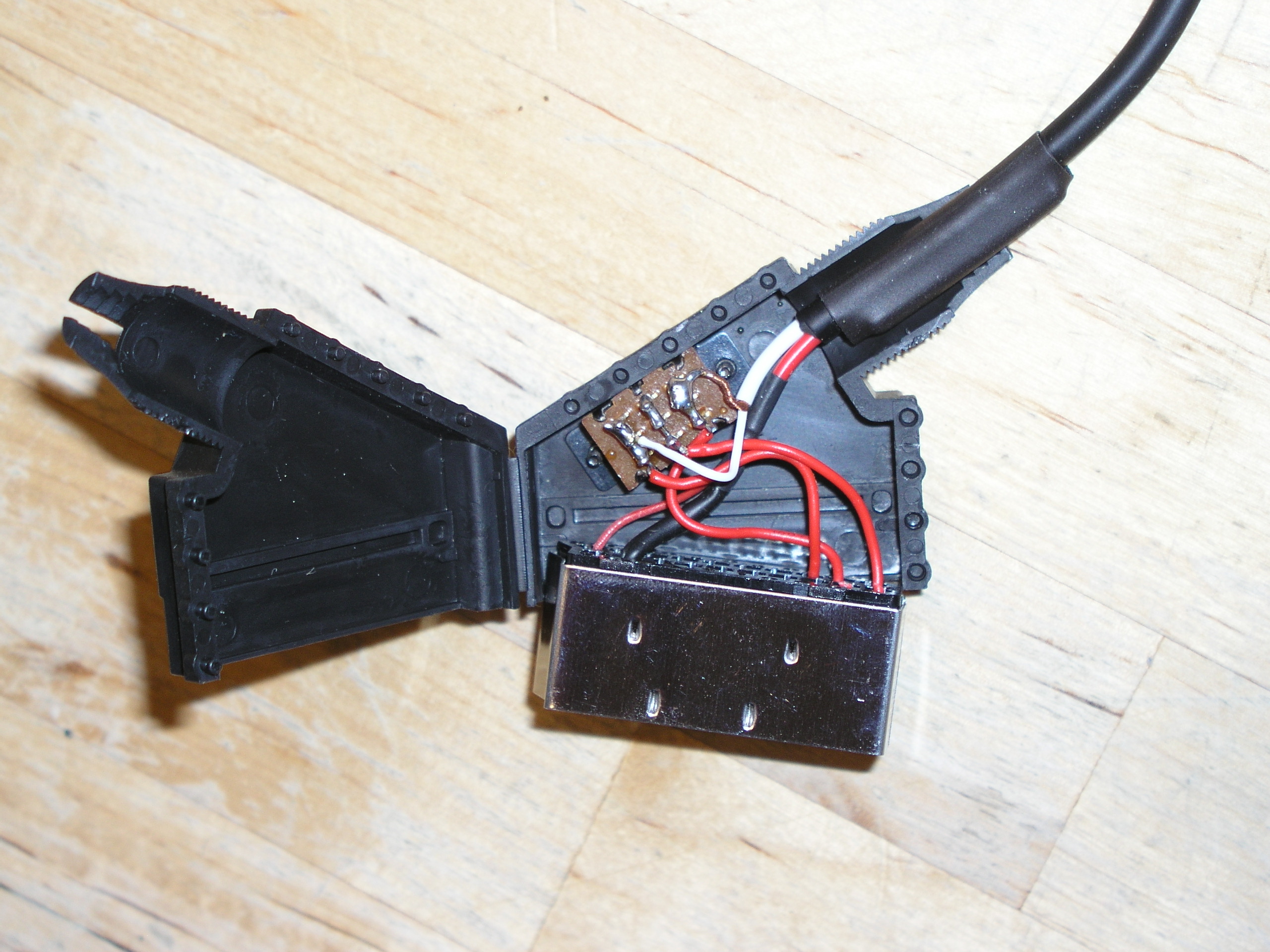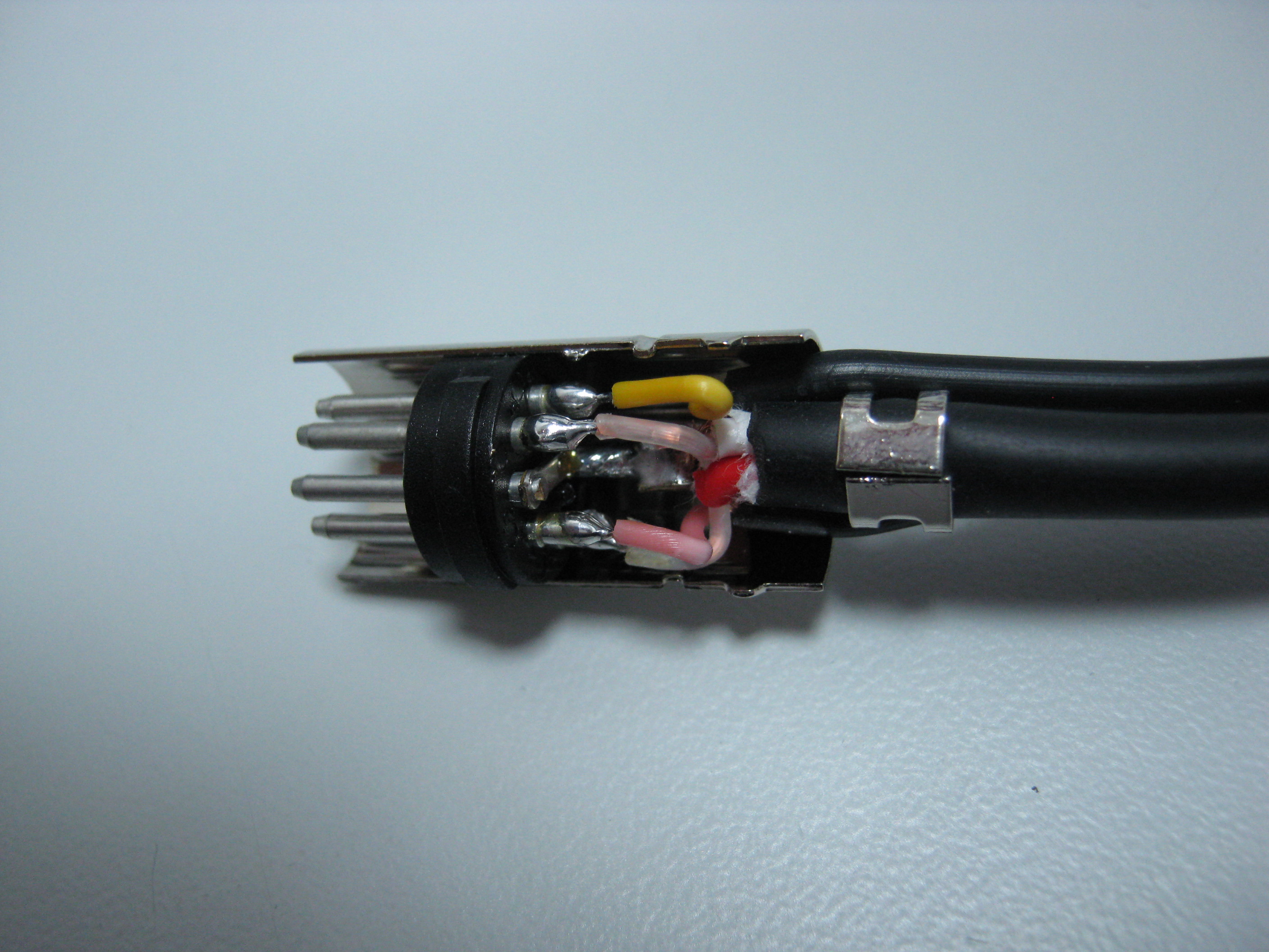 Aber es geht natürlich auch noch billiger: hier glänzt die Abschirmung zwar durch völlige Abwesenheit (auch wenn der äußere Anschein ein Koaxialkabel vorgauckelt), aber es sind immerhin noch richtige Kupferadern im Spiel. Noch billiger geht´s wenn man die Kupferadern an einer Hand abzählen kann und den Rest mit Kunststoffäden auffüllt. Den Sch... kann man dann noch nicht mal so ohne weiteres Löten (wenn dann für eine Reparatur unbedingt muß)...
