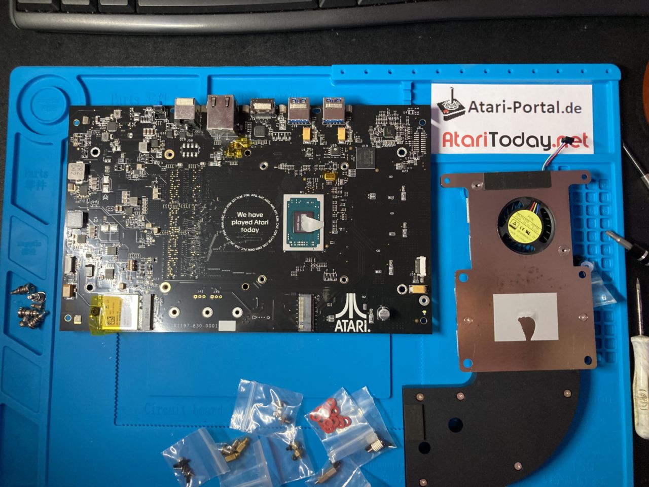 Nun kann man das Mainboard abschrauben. Dazu muss auch das Klarsichtgummi das das Atari Logo beleuchtet entfernt werden. Denn darunter befindet sich die 4.te Mainboard-Schraube von insgesamt vier Schrauben. Danach das Mainboard umdrehen.