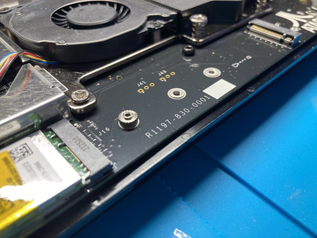 Unten links: Mit dem gelben Aufkleber versehen ist das Bluetooth/WLAN Modul auf M.2 Schnittstelle. Rechts daneben ist die M.2 Schnittstelle für die interne SSD. Direkt unter dem Lüfter ist die CPU. Der RAM befindet sich auf der anderen Seite des Motherboard.