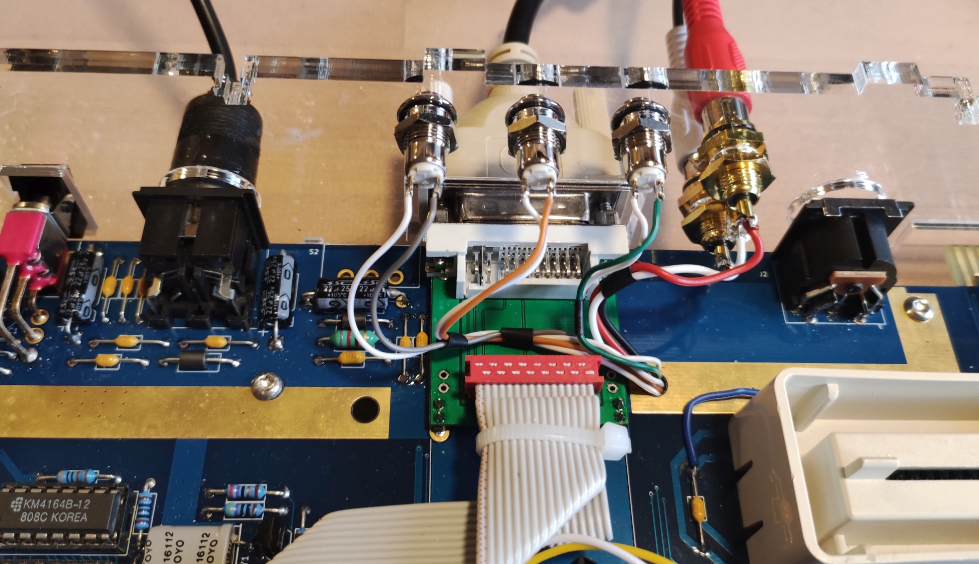 Falls die TK-II Stereo Erweiterung genutzt wird, dann ist normalerweise auf der Adapterplatine auch eine Klinkenbuchse verlötet, die wollte ich aber nicht seitlich haben, sondern als Ausgang lieber die Cinch-Buchsen auf der Rückseite in der Näher der DIN Buchse nutzen. Netterweise sind aber auf der kleinen Platine auch Abgriffspunkte für L/R/GND vorhanden. Allerdings muss man noch zwei Brücken setzen auf J3, damit die Signale auch wirklich an den Abgriffspunkten anliegen.