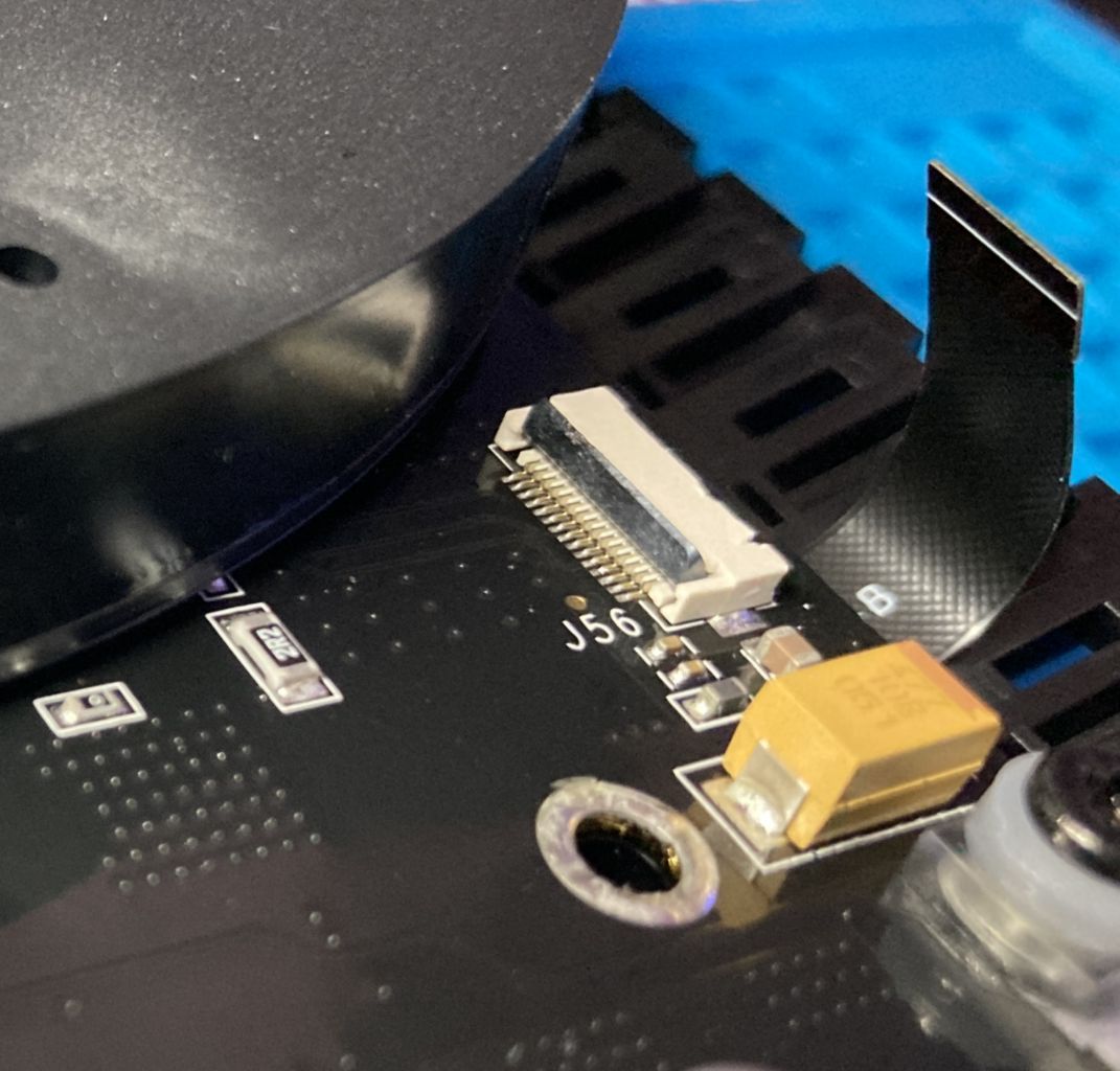 Um das Flachbandkabel links und rechts zu lösen muss man nur jeweils eine kleine Klemme anheben die sich auf der Innenseite des Anschlusses befindet, also auf der Seite die der Mainboard Mitte näher ist. Dabei handelt es sich um ein kleines dunkles längliches Plättchen. Das muss man anheben. Es lässt sich sehr leicht ohne Druck anheben und das Flachbandkabel ist gelöst.