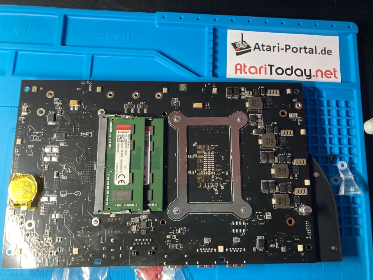 Nun kann man das Mainboard abschrauben. Dazu muss auch das Klarsichtgummi das das Atari Logo beleuchtet entfernt werden. Denn darunter befindet sich die 4.te Mainboard-Schraube von insgesamt vier Schrauben. Danach das Mainboard umdrehen.