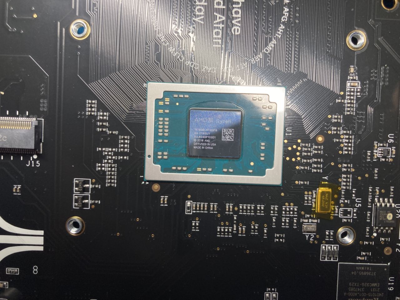 Unten links: Mit dem gelben Aufkleber versehen ist das Bluetooth/WLAN Modul auf M.2 Schnittstelle. Rechts daneben ist die M.2 Schnittstelle für die interne SSD. Direkt unter dem Lüfter ist die CPU. Der RAM befindet sich auf der anderen Seite des Motherboard.