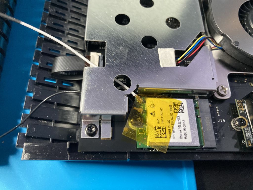 Die Antennenkabel zum WLAN/BT Modul sind extrem kurz und könnten abreißen. Wer das o.g. Antennenset besorgt hat, kann die Kabel von den Anschlüssen lösen und die Antennen aus dem Gehäuse entfernen.