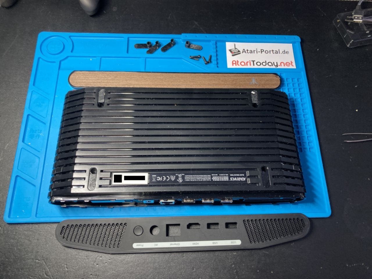 Nun kann man das Mainboard abschrauben. Dazu muss auch das Klarsichtgummi das das Atari Logo beleuchtet entfernt werden. Denn darunter befindet sich die 4.te Mainboard-Schraube von insgesamt vier Schrauben. Danach das Mainboard umdrehen.