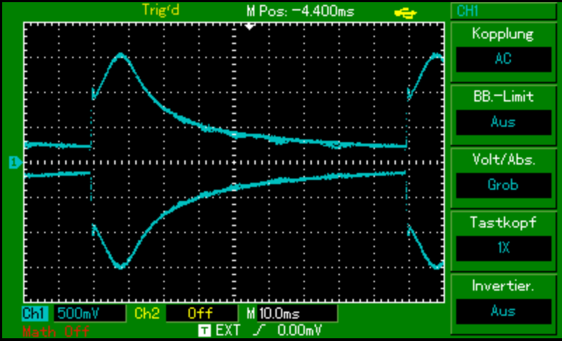Nach mühsamen (Sprachkenntnisse) Durchforsten der Anleitung des Funktionsgenerators fand ich die Sweep Funktion. Damit läßt sich ein Frequenz Bereich automatisch abfahren - gut. Und Trigger Out (Lo oder Hi) gibt es auch - schön. Am Ende konnte ich mit dem Triggersignal den DSO triggern. Natürlich(?) muß die Ablenkfrequenz des DSO im richtigen Verhältnis zur Triggerfrequenz stehen, aber es geht.