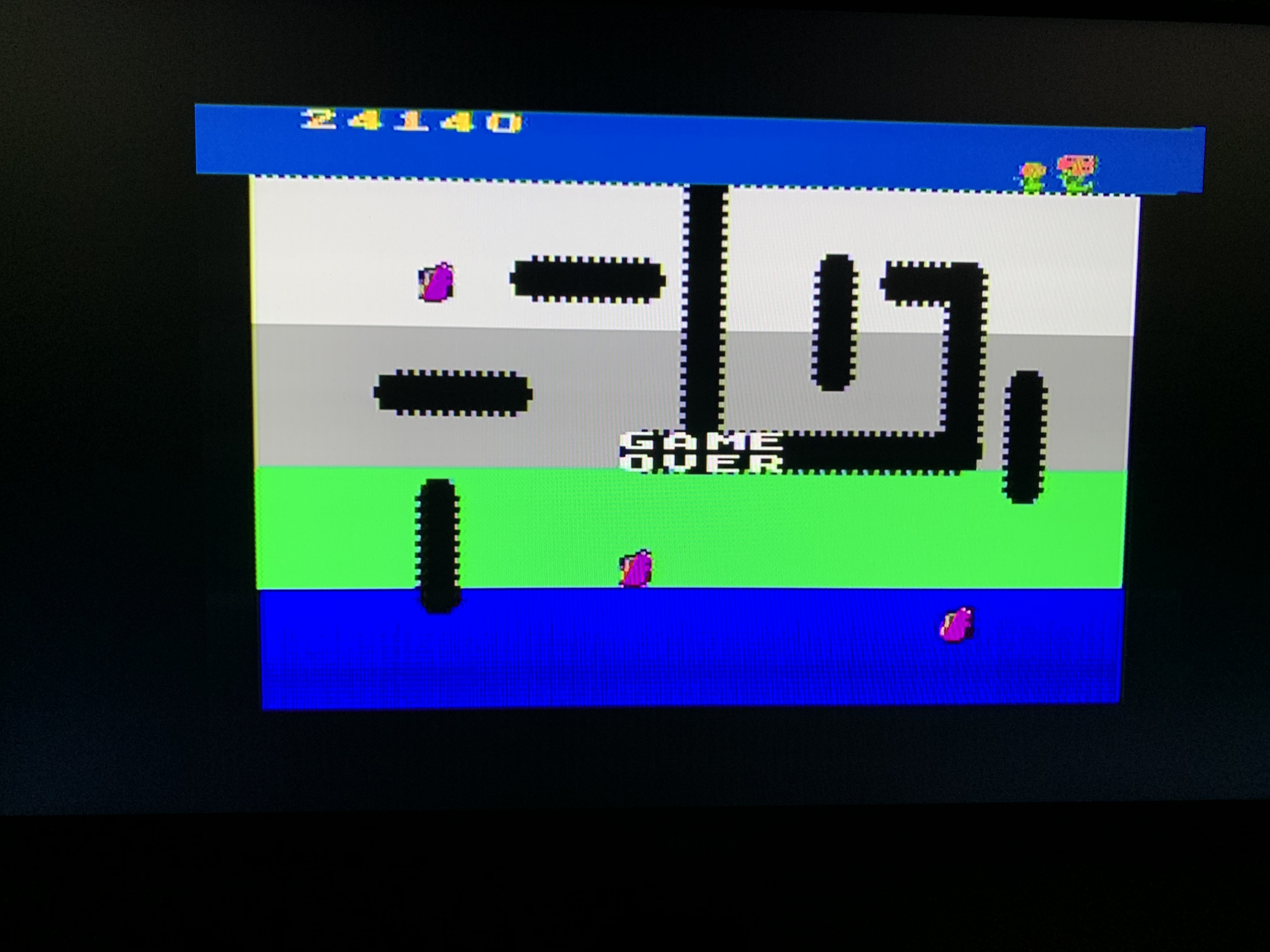 Also, meiner Meinung nach spielt sich die Modulversion ((c) 1982/1983) mit dem "steinigen" Hintergrund deutlich besser. Bei der uni-Hintergrundversion fnde ich es sehr schwierig mehrere sich überlagernde oder dicht hintereinander laufende Gegner aufzupumpen.