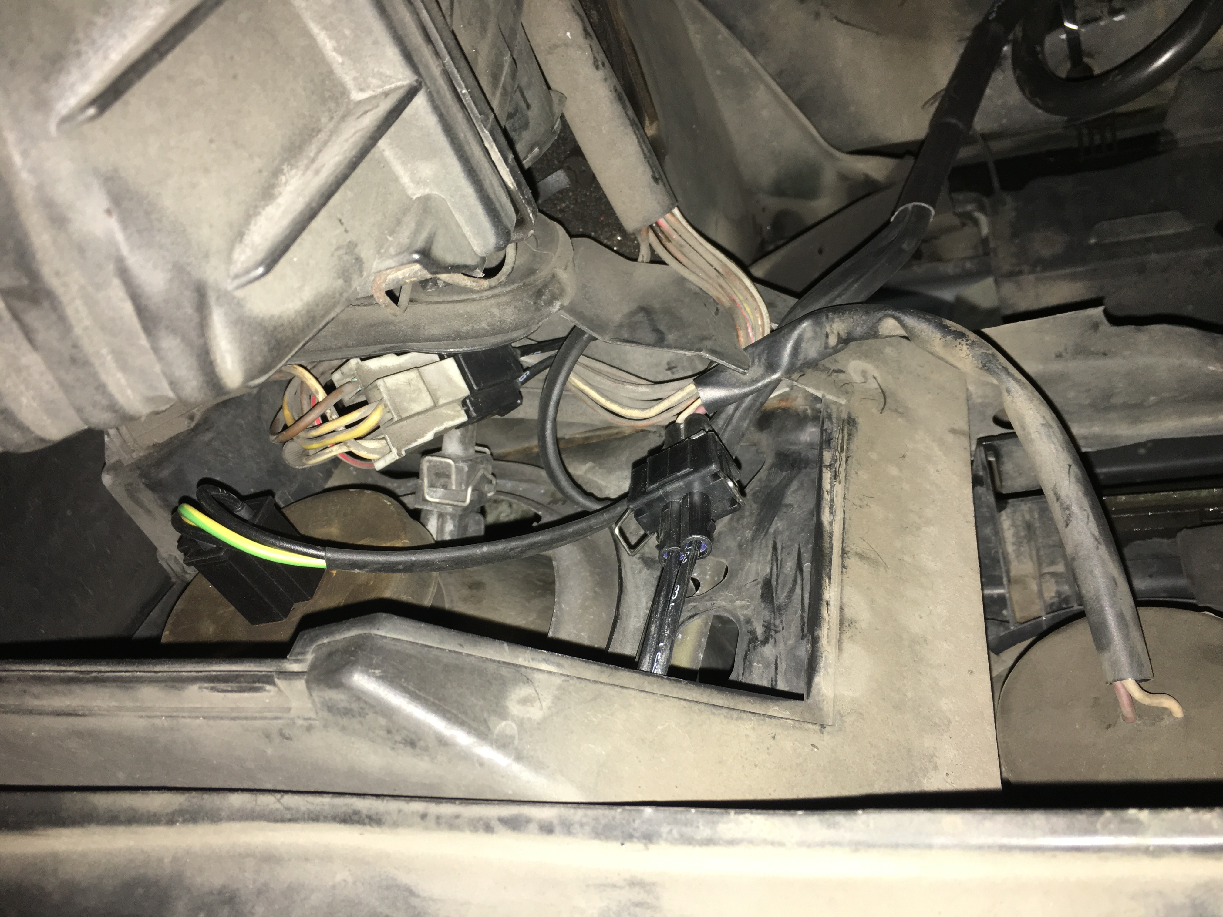 Kommen wir jetzt zu "im Prinzip recht einfach" / "* hüstel *": Auf der Beifahrerseite habe ich sofort die richtigen Stecker gefunden. Auf der Fahrerseite hingegen gabe es auf den ersten Blick Richtung Kotflügel zwei identische Stecker für den Zusatzscheinwerfer. Hm, also den ersten probiert. Mist, mit dem Fernlicht ging die Hupe los. Also den anderen Stecker probiert. Mist, das ist auch die Hupe?!? Jedenfalls wußten jetzt alle Nachbarn daß ich am Auto rumfummele. Nach etwas suchen fand ich dann eine dritte identische Steckerverbindung Richtung Kühler - das war dann aber der Zusatzscheinwerfer. * gg *