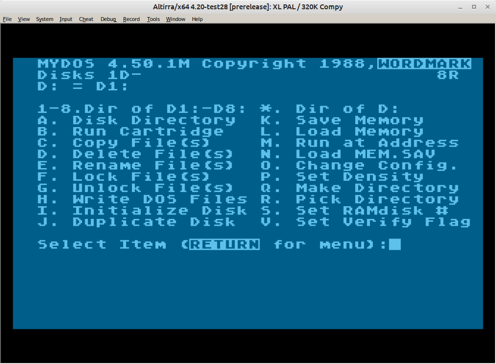 Dann SDX im IDE Plus ausgeschaltet und über SIO2PC vom einer MyDOS Diskette (D1) gebootet.