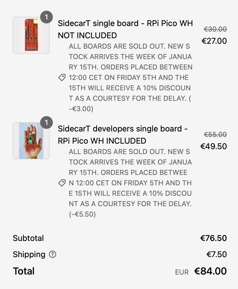 Seit heute Mittag gibt es 10% Rabatt auf das SidecarT. Wer also eines, oder mehrere möchte, kann genau jetzt zuschlagen. Gerade ist zwar kein Board erhältlich, aber am 15.1. gibt es neue, und bis dahin gibt es 10%.