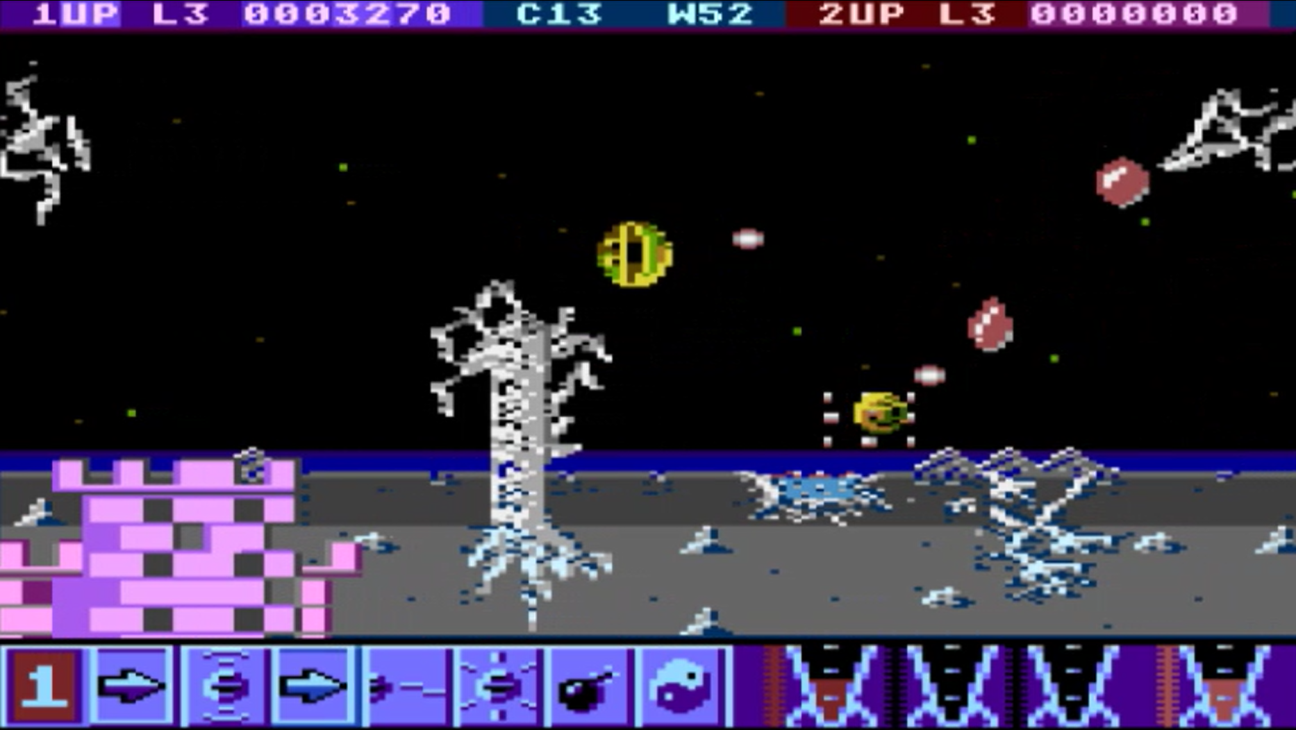 Haus des Zauberers: Durch links/rechts Bewegung und Feuerknopf des Joysticks kann ein permanentes Extra gewählt werden. Diese stehen auch nach Verlust eines Lebens sofort wieder zur Verfügung.