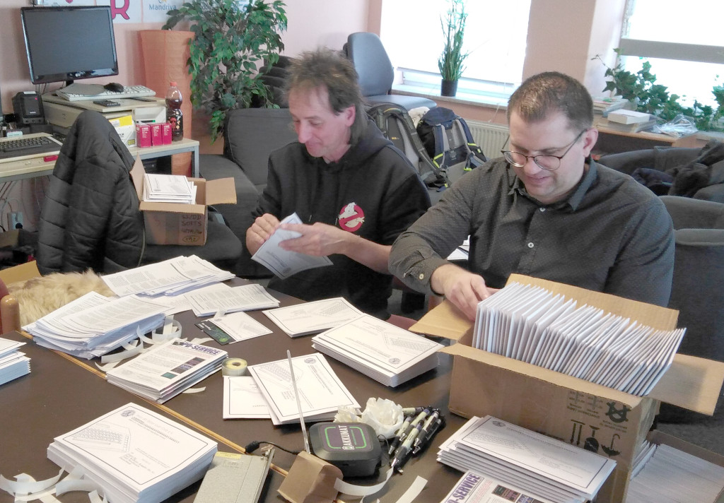 Gestern waren alle Magazine nach ca. 4 Stunden "eingetütet" und Versandfertig. Dabei waren immer bis zu vier Personen gleichzeitig am Tisch. Das hat mit dem "fliegenden Wechsel" (wer halt gerade Zeit und Lust hatte kam dazu) aber nur geklappt, weil Carsten und Dirk die ganze Vorarbeit schon geleistet hatten. Also Bedrucken und sortieren der Umschläge etc.