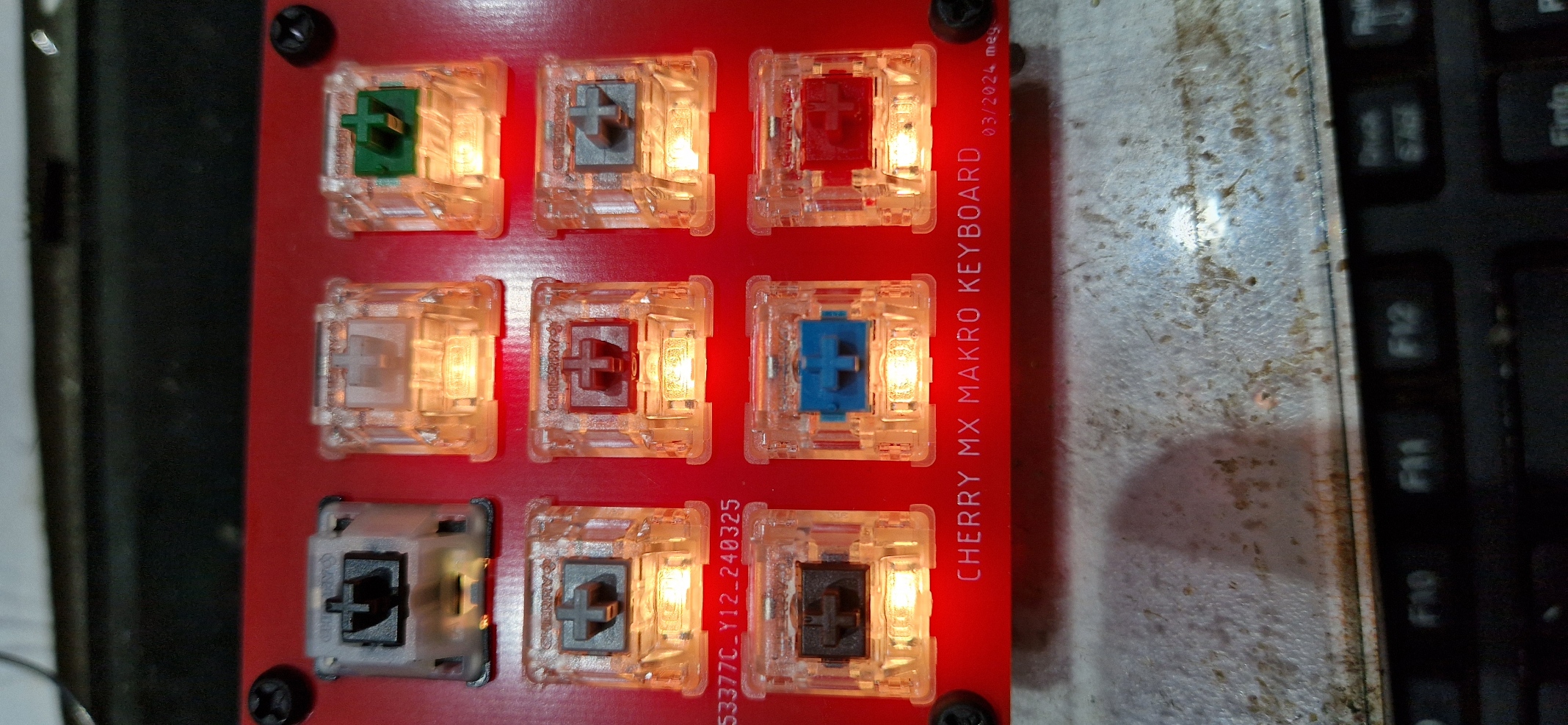 hab ich nun komplett bestückt. D.h. alle Sockel, LEDs, Abdeckplatte und MX Tasten aus dem Probierkit