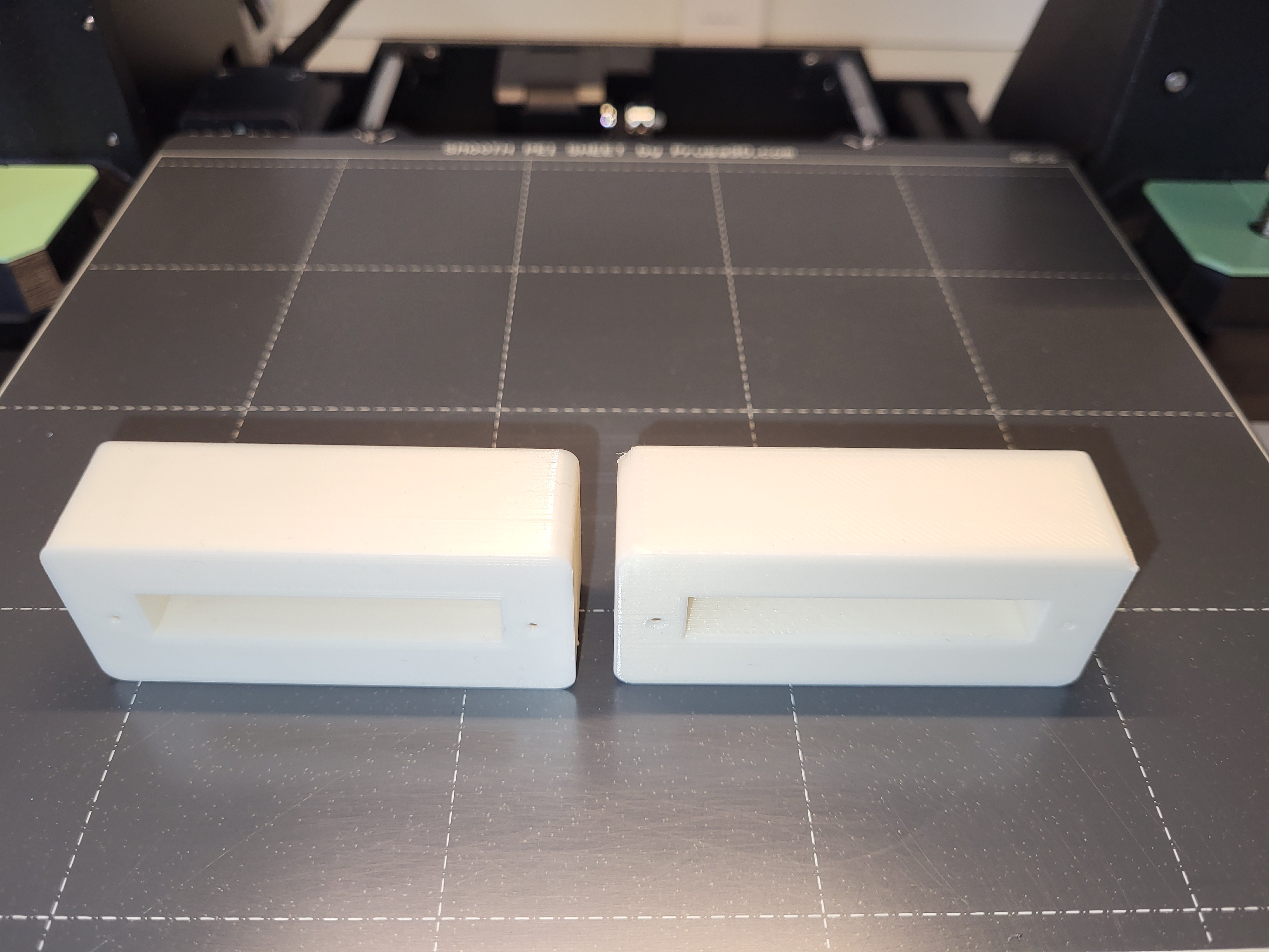 So, ich hab mal zwei Probedrucke gemacht. Beide sind zusammen auf einem Druckblech gedruckt worden, einmal normal, einmal auf die Seite gelegt. 0,15mm Layer, 0,4mm Düse, Qualitäts-Einstellung, Stützen überall aktiv. Filament Prusament PLA Vanilla White (paßt sehr schön zum XL Beige).