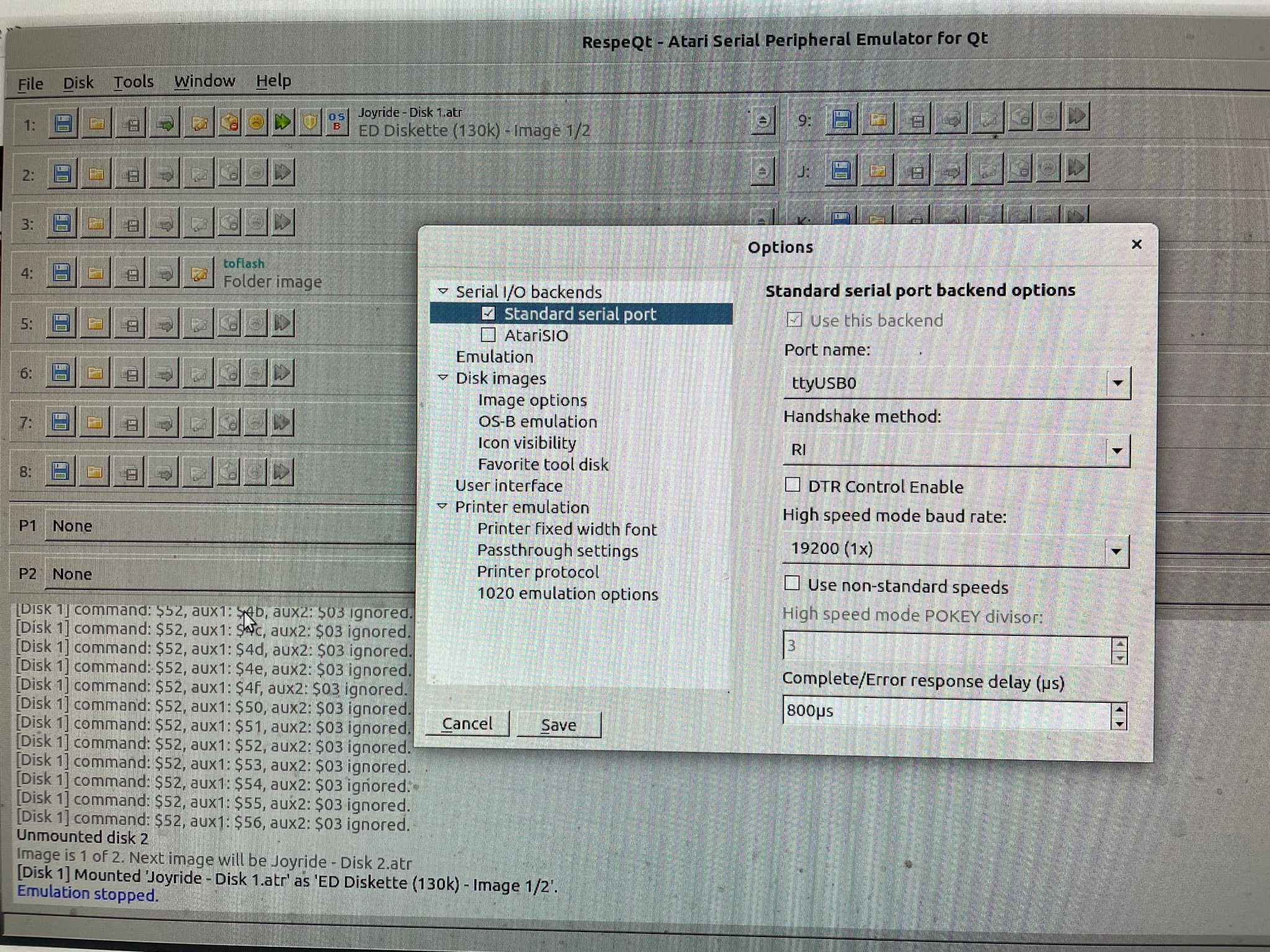 Nur den RespeQt und auch vorher den AspeQt bekomme ich nicht ans laufen. Die Schnittstelle ist wie beim Atariserver /dev/ttyUSB0, natürlich laufen nicht beide gleichzeitig. RespeQt kommuniziert nicht mit meinen Geräten.