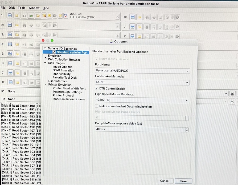 Nur den RespeQt und auch vorher den AspeQt bekomme ich nicht ans laufen. Die Schnittstelle ist wie beim Atariserver /dev/ttyUSB0, natürlich laufen nicht beide gleichzeitig. RespeQt kommuniziert nicht mit meinen Geräten.