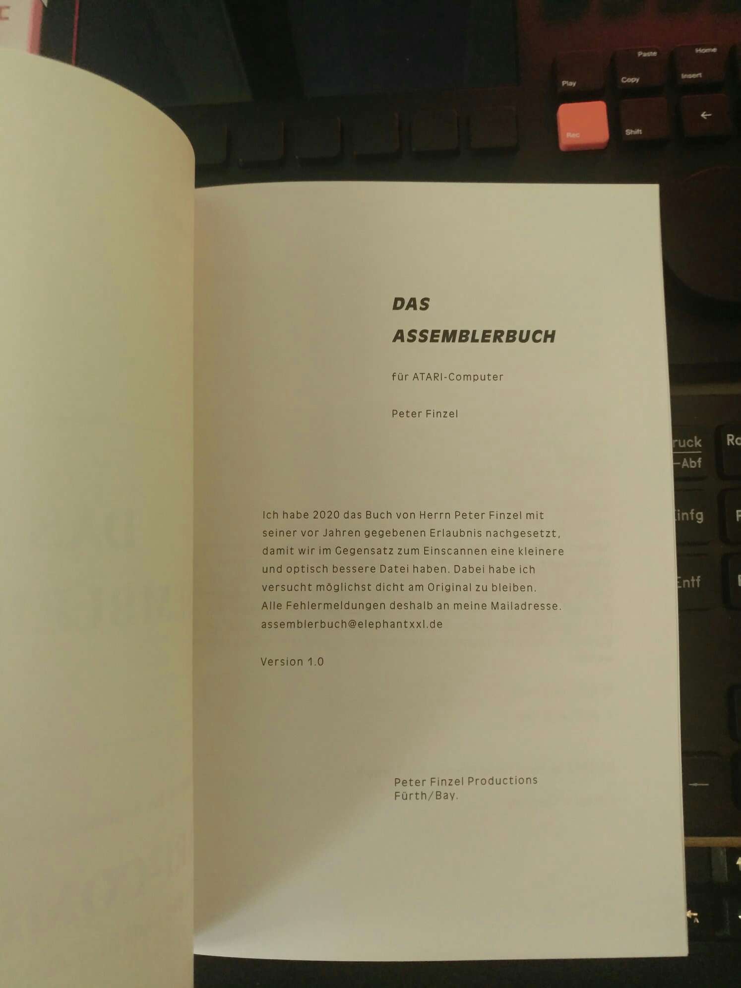 Ich habe mir das Assemblerbuch bei einem Onlinedienst als Taschenbuch anfertigen lassen. So kann man in Ruhe darin blättern, auch, wenn man am ATARI sitzt. Leider hab ich versäumt, Details mit dem Support zu klären (man hat es ja auch eilig!), so daß Buchrücken und Rückseite nicht bedruckt, sondern nur gelb sind. Aber egal!