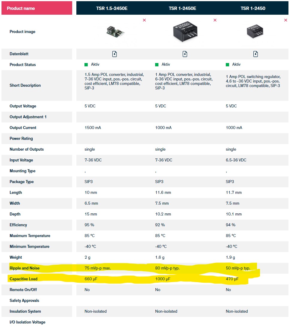 Es gibt schon noch mehr Unterschiede. Die e-Variante ist offen und birgt damit (auch wenn unwahrscheinlich) das Risiko eines Kurzschlusses beim Basteln. Entscheidender ist aber, daß die allgemeine Schaltfrequenz unterschiedlich ist: Der Standard-TSR1 hat einen Bereich von 400-600 kHz - als typisch gibt der Hersteller 500 kHz an.Olix hat geschrieben: ↑18.11.2021 09:49Dort werden die Wandler TSR1-2450 und TSR 1-24120 empfohlen.