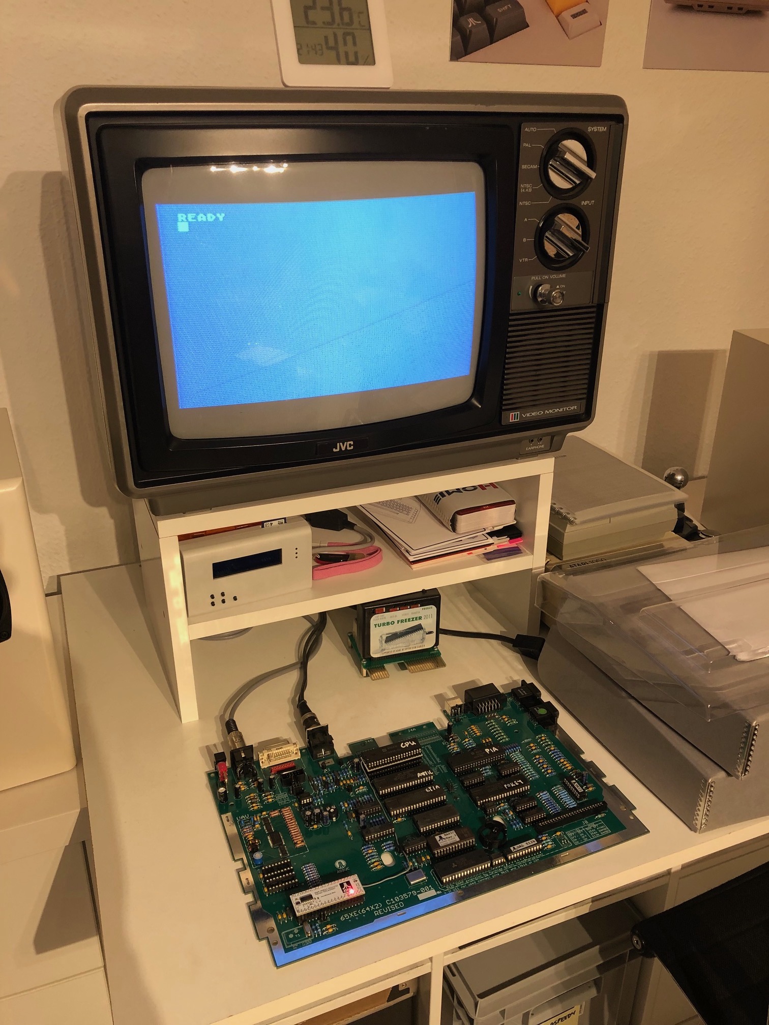 Ich habe auch ein Gehäuse zu wenig. für mein neues schönes XE-Board musste auch ein altes Board den Platz frei machen. Ich habe aber aus der Not eine Tugend gemacht, Sämtliche ICs gesockelt, ein TK-II PS2 Anschluss für die Tastatur eingebaut, die Funktionstasten auf kleine Taster gelegt und das Board auf den Deckel einer Box verschraubt. Jetzt habe ich immer ein Testboard schnell Griffbereit wenn ich mal Vergleichssignale mit dem Oszi messen möchte oder ein IC auf Funktion tauschen möchte.