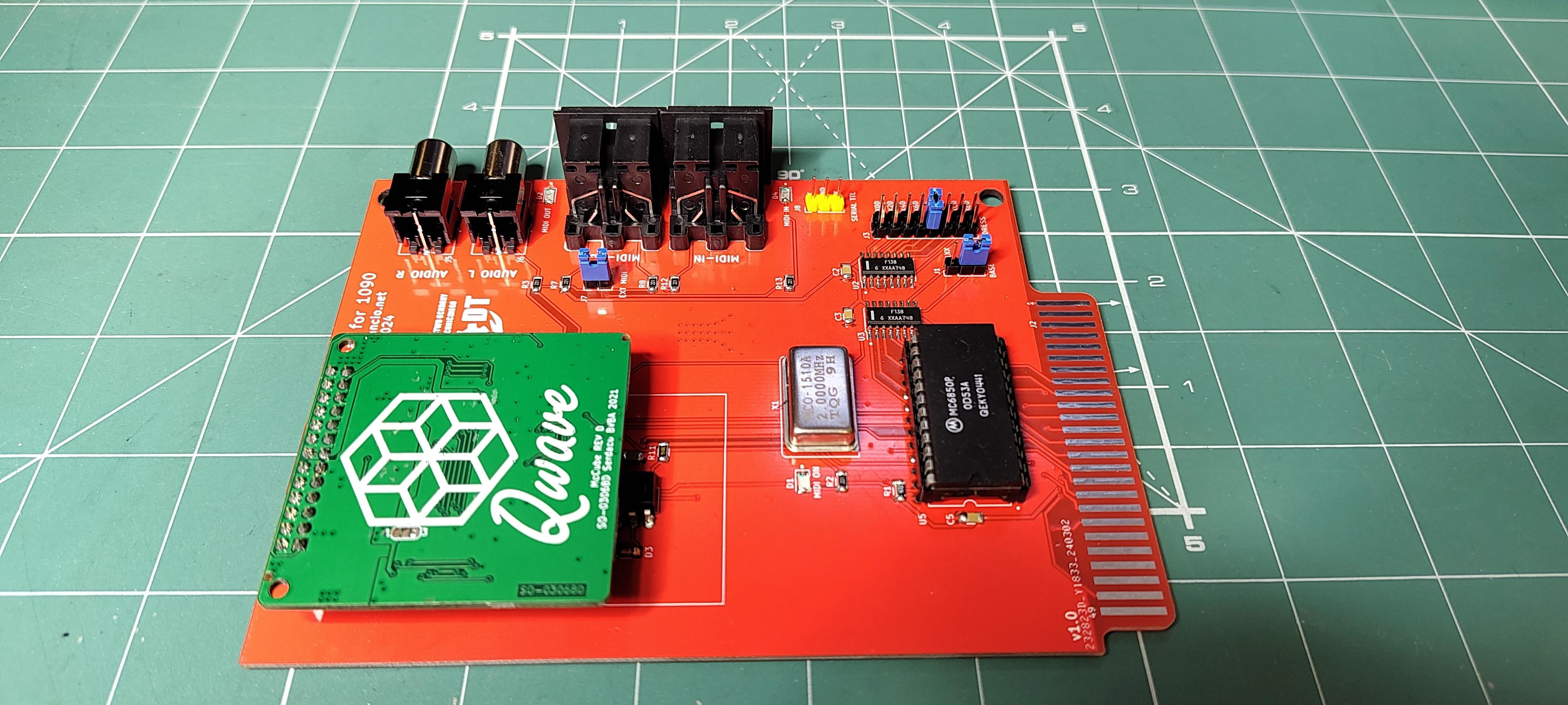 Getting the interface working required the MC6851 to transmit a bus busy signal to /DBUFSEL in its address space, which I'd forgotten about at the time. Fixing this is quite simple: just a diode between the decoder and /DBUFSEL – so if you have my old MIDIcar 1090, it can be easily "repaired." Additionally, it turned out that the Wavetable module might not have worked because it required a pull-up of the RESET signal.