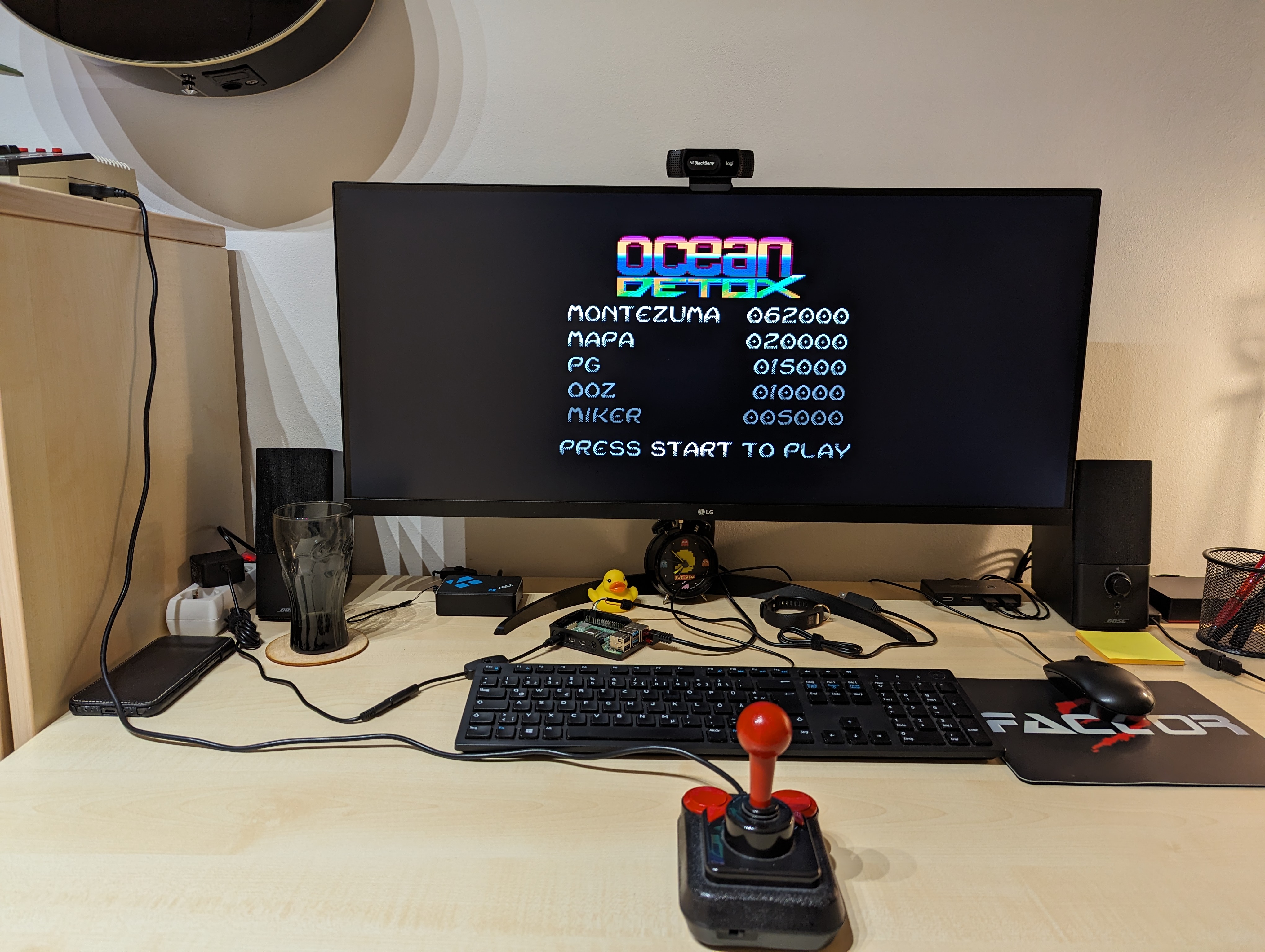 Der Bildschirm hat eine Auflösung von 2560 × 1080, ist damit ohne Skalierung gut lesbar, und das reicht mir für meine Einsätze: für die Arbeit, zum Filmegucken mit KODI und zum Spielen mit einem Atari (mit Sophia2).