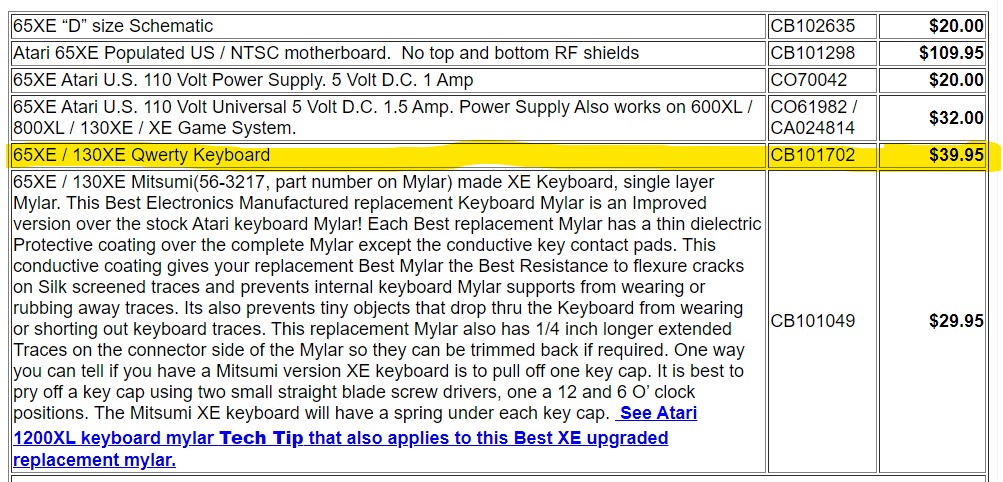 Ich habe vor kurzem 2 Tastaturen bestellt und am Schluss hat mich dann eine 85 Euro gekostet. Natürlich kann man versuchen für den Preis einen gebrauchten XE zu ergattern, und hat dann neben der Tastatur auch noch alle anderen Teile, aber eben keine unbenutzte, unvergilbte Originaltastatur mit Funktionsgarantie. Ich musste übrigens Bradley zunächst überzeugen, dass ich die Tastaturen wirklich haben möchte, denn auf Grund der hohen Portokosten wollte er sie mir zunächst gar nicht verkaufen. (Das ist dann aber typisch Bradley, da muss man dann sehr diplomatisch vorgehen, sonst kann es passieren, dass man gar nichts mehr bekommt)