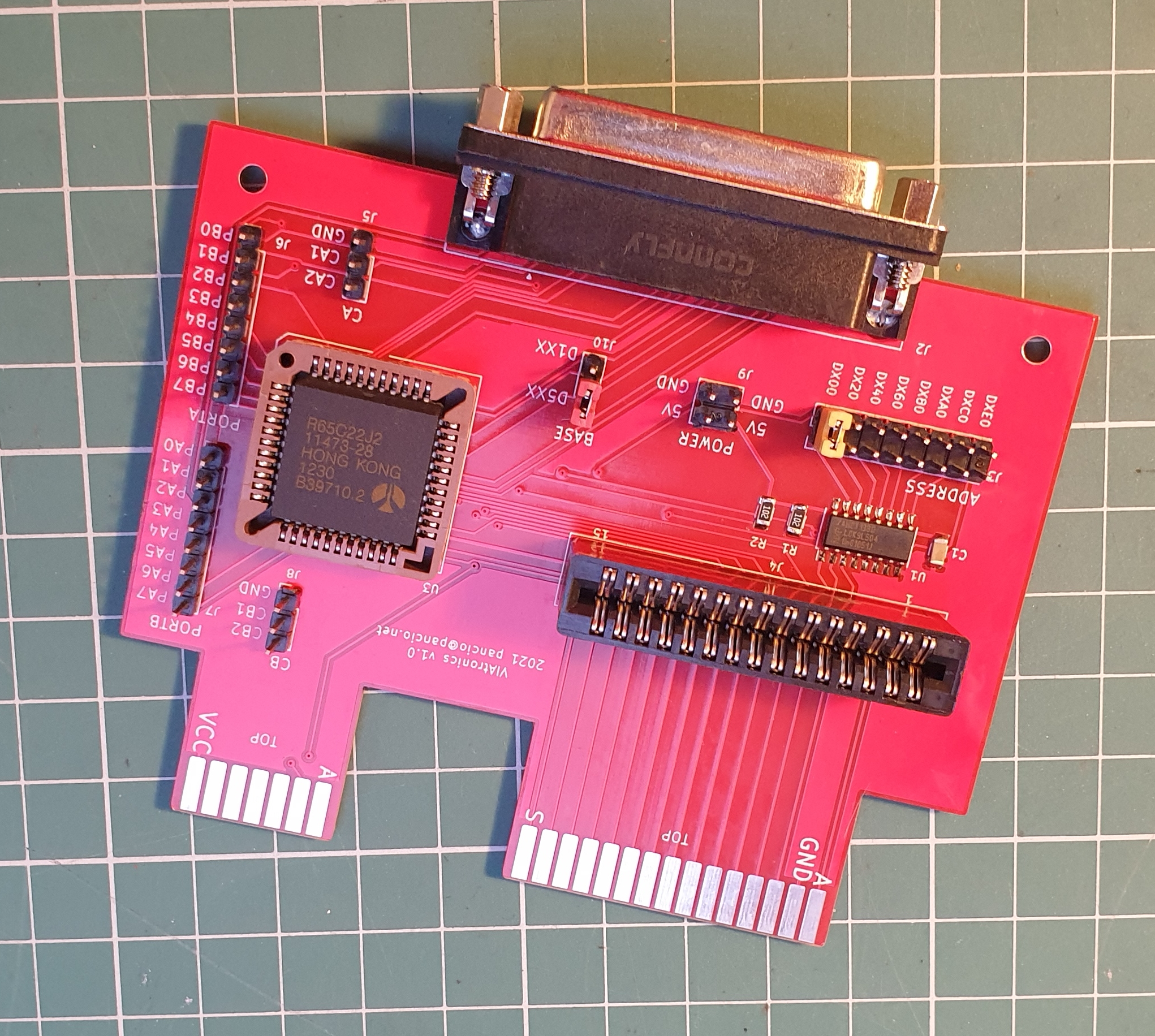 PCB based on standard CART/ECI slot contains VIA6522 two 8-bits parallel ports with control signals. Additional IC 74HCT138 is use as address decoder. All required by printer signals are connected to DB25 female port. On the PCB you may find selector for device address which can be selected from $D100-$D1E0 or $D500-$D5E0 with $20 step.Additional four pin header are connected to PA/PB/CA/CB signals and might be use for other task depend of your idea :-)If you are using cartridge e.g. Koala Illustrator or some text editor, you may use it together with VIAtronics but you need to check addresses used by cartridge to avoid conflict with VIAtronics.Project is made as Free Hardware - full documentation will be available on my page: https://systemembedded.eu
