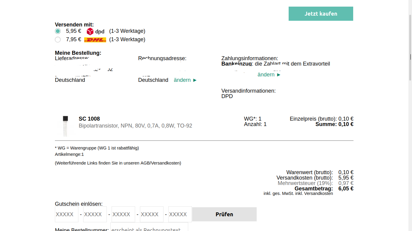 5,95 € hat Reichelt also Versandkosten! Rechnen wir das nun auf die Schalter um. Ich brauche 2 Schalter, bei Reichelt a 1,95€, also 3,90+5,95=9,85€. Und habe dann noch keine Dreknöpfe!