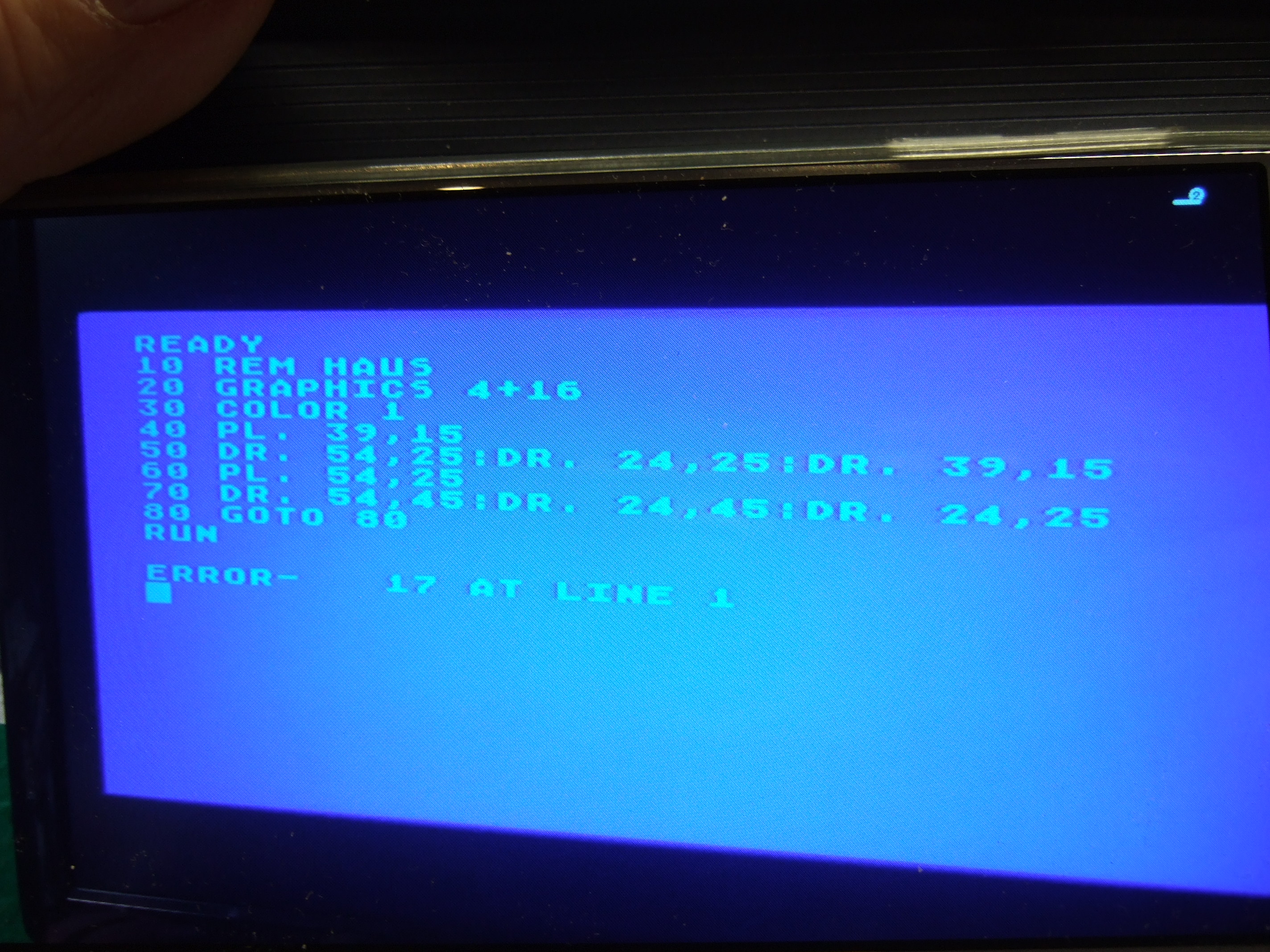 Wenn dein Enkel jetzt noch „L.“ für „List“ eingibt, dann sollte sowohl die fehlerhafte Zeile 1 gelistet werden, welche den Error 17 erzeugt, als auch die restlichen Befehle ausgeschrieben werden. Die Abkürzungen werden nämlich nicht „on the fly“ ausgeschrieben, sondern erst durch Eingabe des List-Befehls.