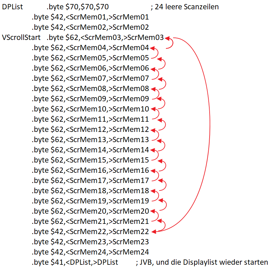 In Endeffekt habe ich nun zwei Displaylisten und lasse darin den MemScan wandern. Also $40 in der Displaylist mit der Angabe des Speicherbereiches.