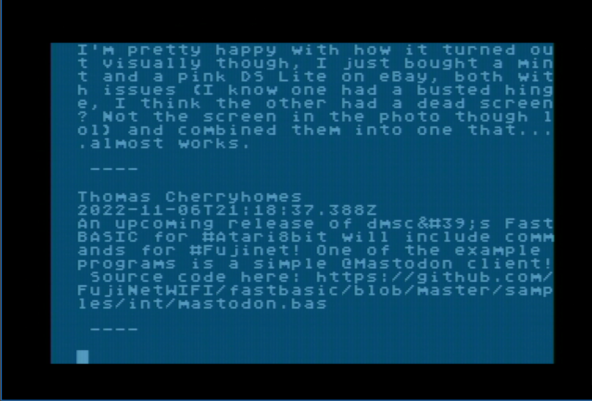 An upcoming release of dmsc's FastBASIC for #Atari8bit will include commands for #Fujinet! One of the example programs is a simple @Mastodon client!