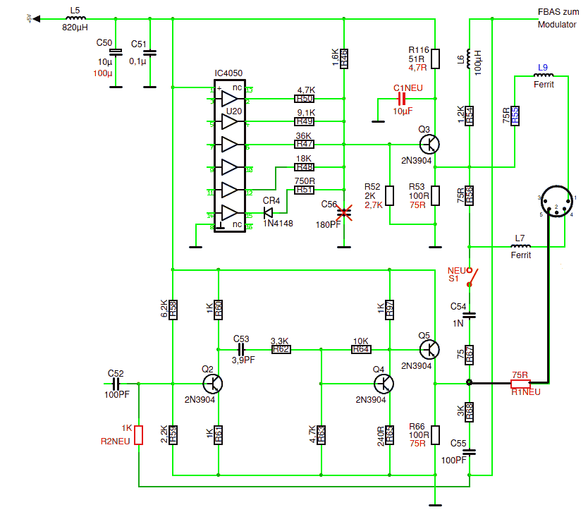 Verbinde mit einer Litze und einem 75 Ohm Widerstand den Pin 5 der AV-Buchse mit dem gemeinsamen Punkt von R67 und R 68.