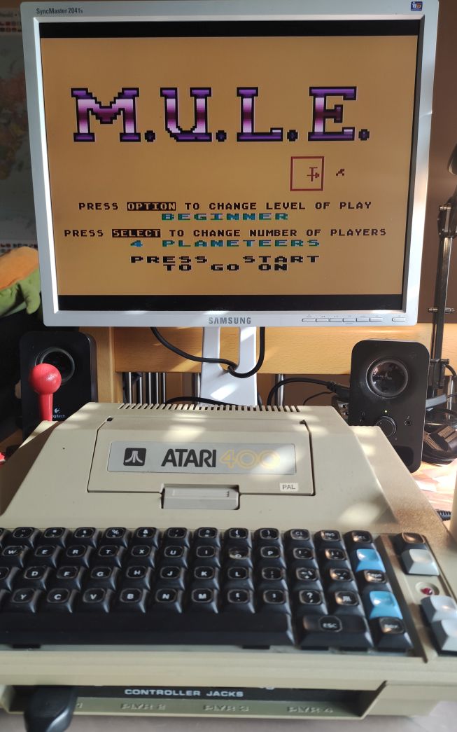 Atari 400 läuft wider und hat jetzt die SuperColorCPU Karte (SCCC) von TF_HH und eine moderne 48K RAM-Card mit statischem RAM und 4fach-ROM-Switch, ebenfalls von TF_HH Jetzt habe ich endlich auch einen Rechner auf dem ich M.U.L.E mit 4 Spielern spielen kann.